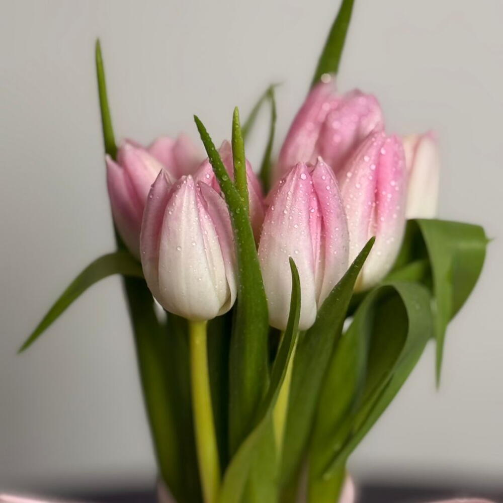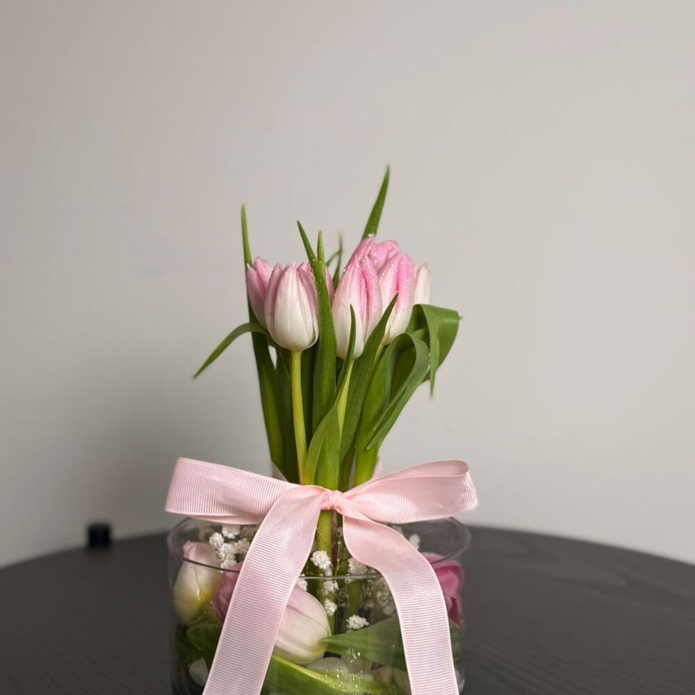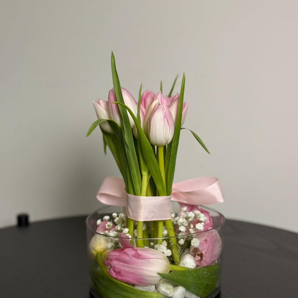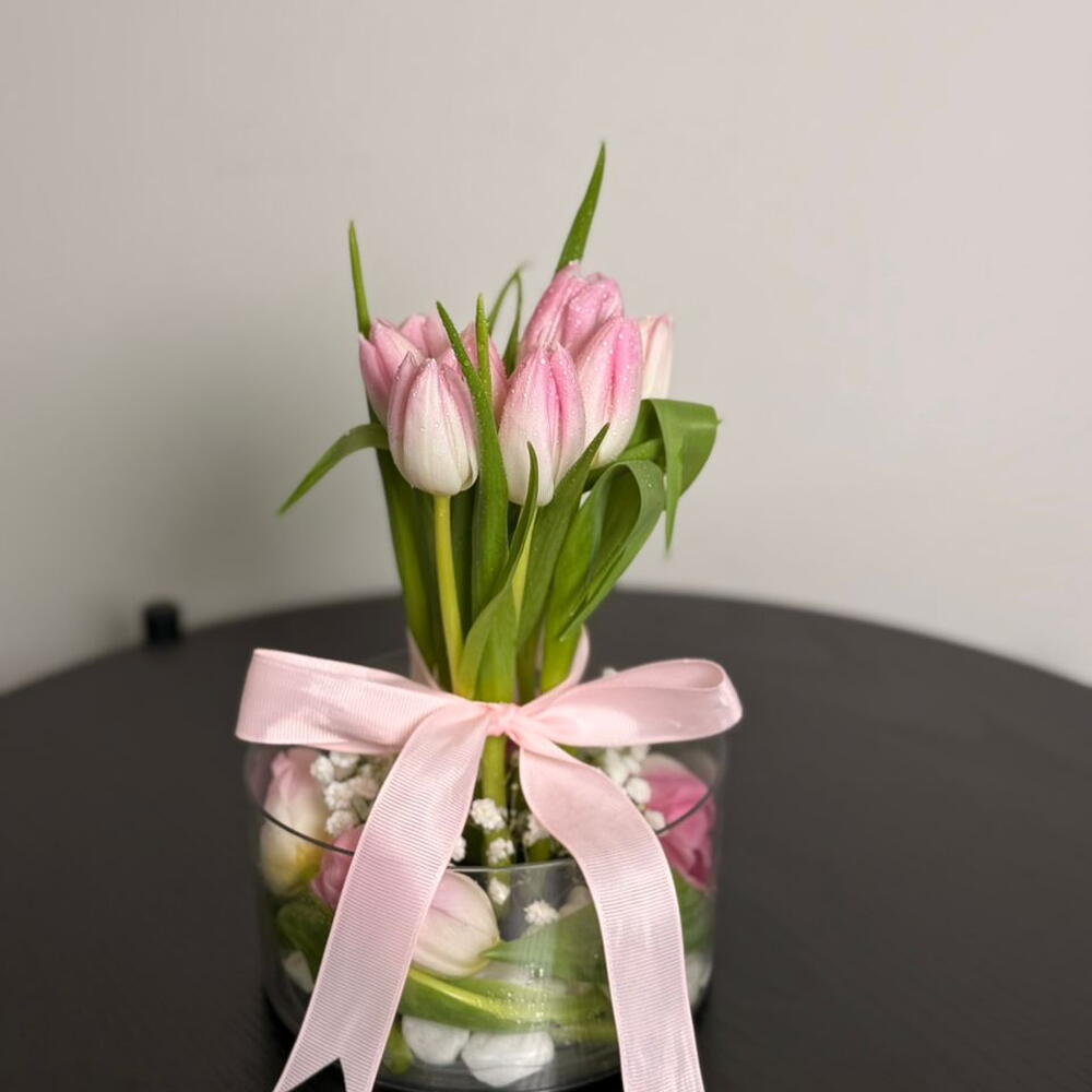 В этой композиции представлены нежные розовые тюльпаны, красиво расположенные в прозрачной круглой вазе. Мягкие розовые тона тюльпанов символизируют любовь, элегантность и нежные чувства. Цветы аккуратно оформлены со свежей зеленью и мелкими белыми соцветиями гипсофилы, создавая естественный и изящный вид. Прозрачная ваза украшена белыми декоративными камнями и перевязана мягкой розовой лентой, что добавляет нежный и элегантный штрих. Это флористическое изделие идеально подходит для подарка, чтобы удивить кого-то особенного или просто добавить штрих красоты в любое пространство. Ее минималистичный, но элегантный дизайн делает ее прекрасным выбором для дней рождения, романтических жестов или продуманных сюрпризов.
