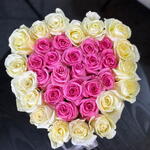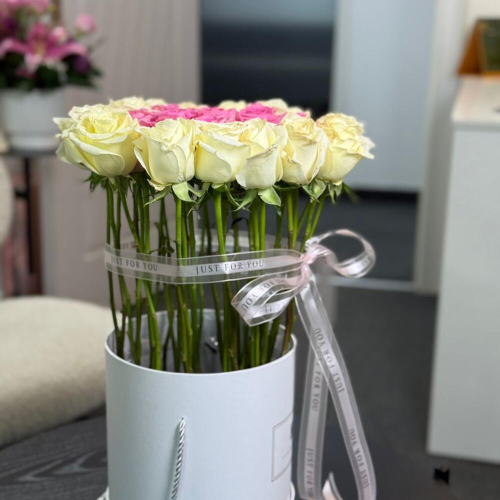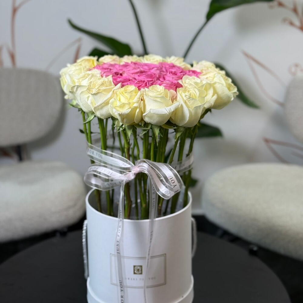 Изысканная композиция в шляпной коробке: мягкие кремовые розы, окружающие нежное сердечко из розовых цветов. Представленная в стильной белой коробке и украшенная элегантной лентой, эта композиция излучает сладость, восхищение и нежную романтику—идеально подходит для дней рождения, юбилеев или сердечных сюрпризов.
