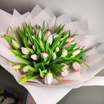 Букет тюльпанов Blush Whisper — мягкая и элегантная композиция с нежными светло-розовыми тюльпанами, окружёнными пышной зеленью. Красиво завернутый в пастельно-розовую бумагу и перевязанный подходящей лентой, этот букет излучает грацию и очарование. Нежные розовые тюльпаны символизируют тёплые чувства, сладость и восхищение, что делает букет идеальным подарком для выражения любви, признательности или искренних поздравлений. Его свежий и минималистичный дизайн создаёт вневременной букет, который кажется одновременно романтичным и изысканным. 🌸✨