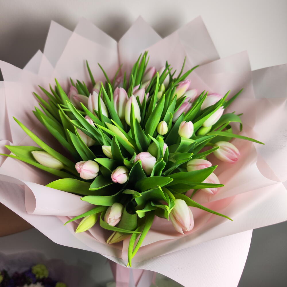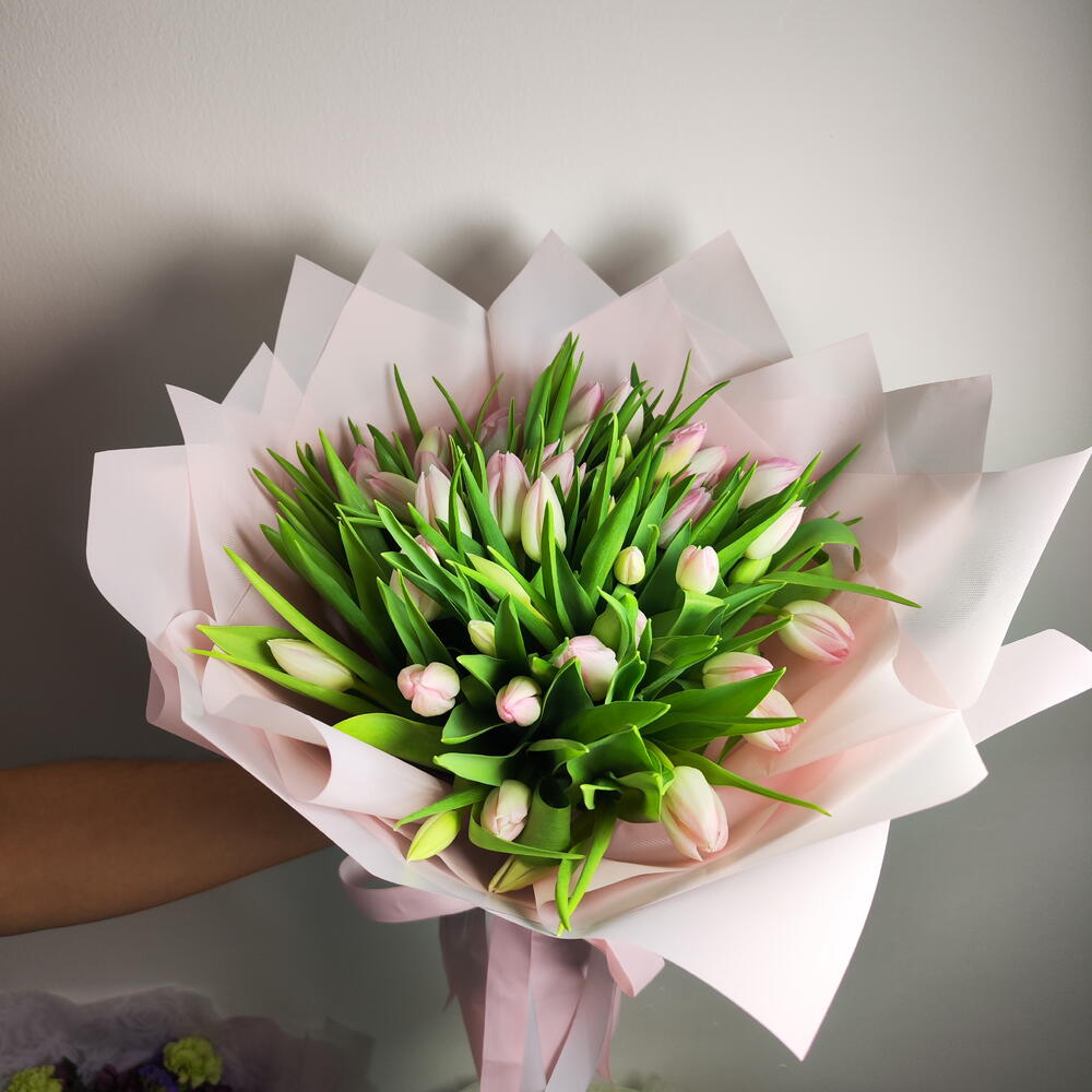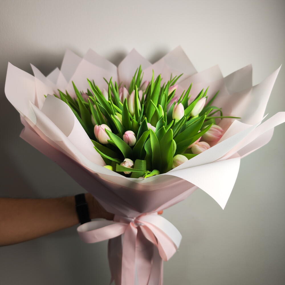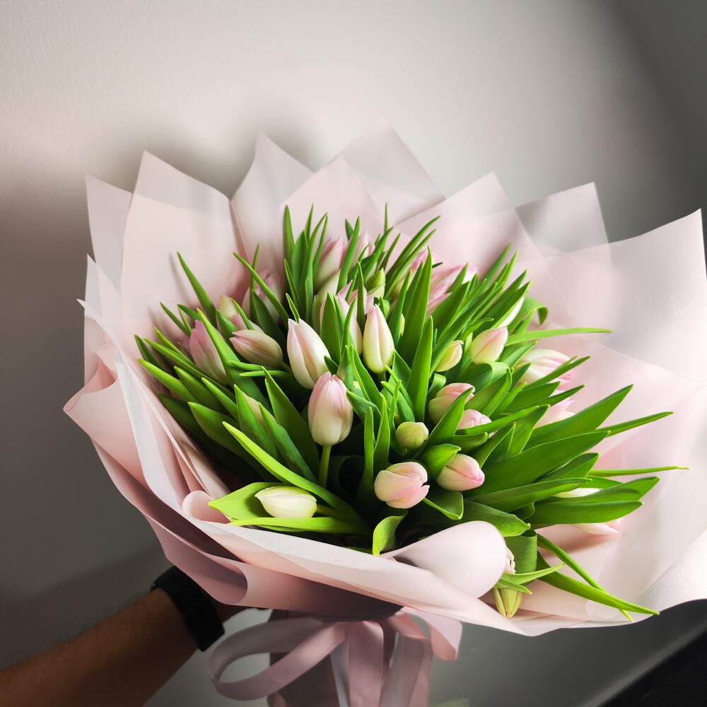 Букет тюльпанов Blush Whisper — мягкая и элегантная композиция с нежными светло-розовыми тюльпанами, окружёнными пышной зеленью. Красиво завернутый в пастельно-розовую бумагу и перевязанный подходящей лентой, этот букет излучает грацию и очарование. Нежные розовые тюльпаны символизируют тёплые чувства, сладость и восхищение, что делает букет идеальным подарком для выражения любви, признательности или искренних поздравлений. Его свежий и минималистичный дизайн создаёт вневременной букет, который кажется одновременно романтичным и изысканным. 🌸✨