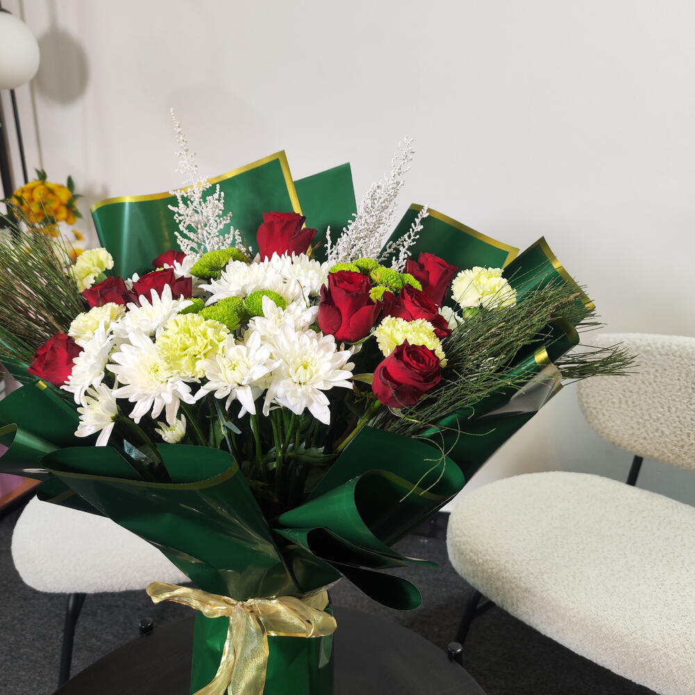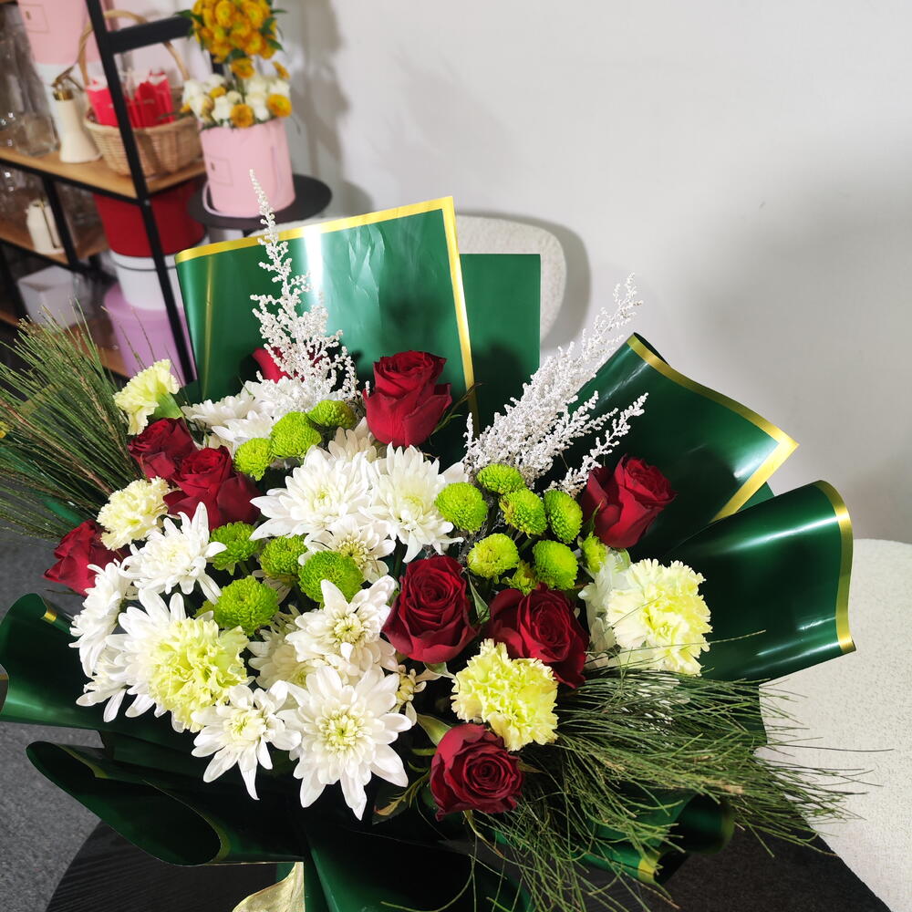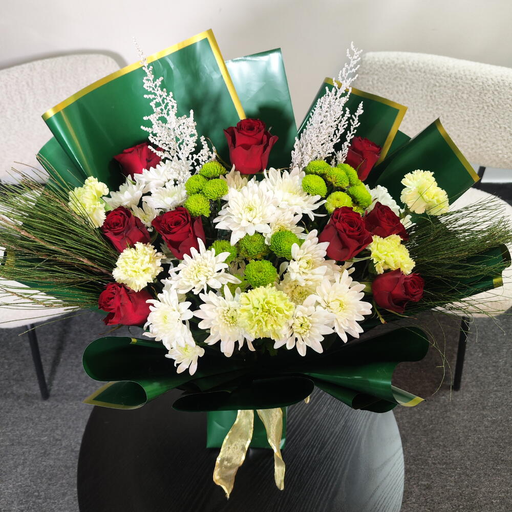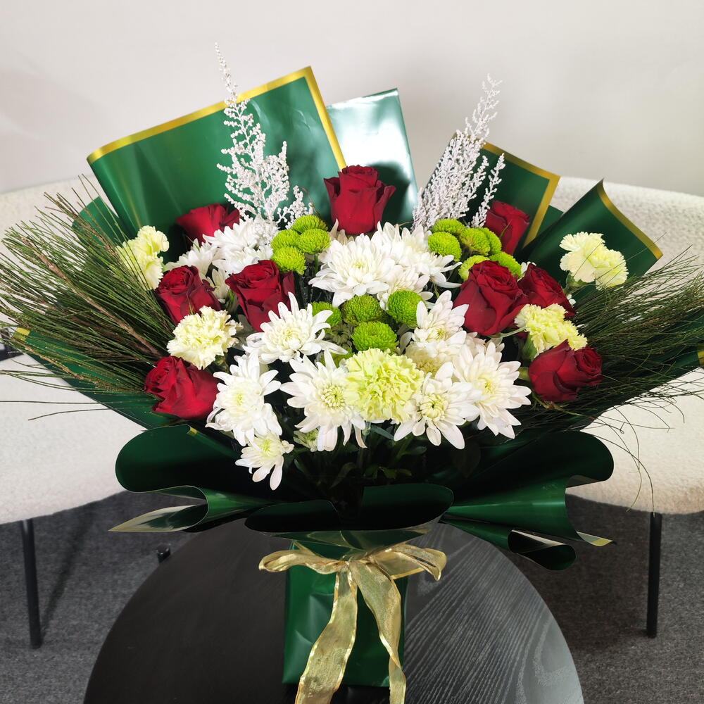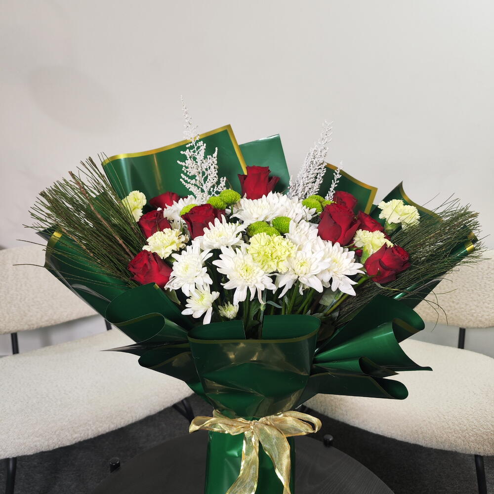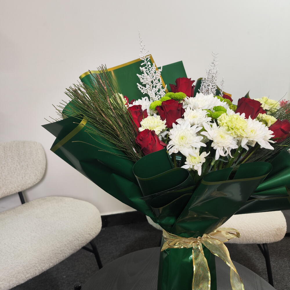 Это классический и элегантный букет, собранный вручную. Глубокие красные розы сочетаются со свежими белыми хризантемами и нежными зелёными бутонами. Украшенный воздушными белыми наполнителями и хвойной зеленью, он приобретает утончённый сезонный оттенок. Завёрнутый в богатую изумрудно-зелёную бумагу с золотой окантовкой и перевязанный золотой лентой, букет выглядит роскошно, празднично и вневременно — идеален для торжеств, официальных мероприятий или искренних подарков.