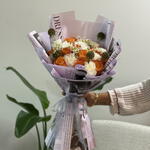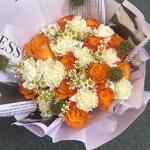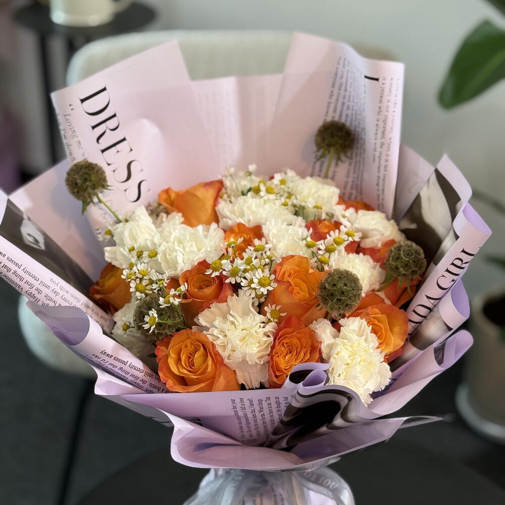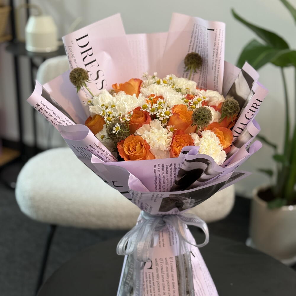Почувствуйте вечную элегантность нашей композиции Florists Special. Этот букет, выполненный вручную, содержит дюжину оранжевых роз, которые создают яркий акцент на фоне 11 гвоздик Moonlight White. Пять цветов скабиозы придают долю игривости, а завершающий штрих — пять Tanacetum single vegmo — обеспечивает мягкий контраст и интересную текстуру. Идеально подходит для любого повода, этот букет гарантированно произведёт неизгладимое впечатление. На его изготовление потребуется 15 минут.