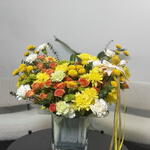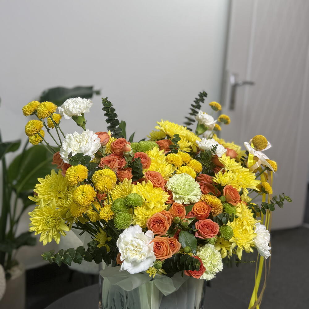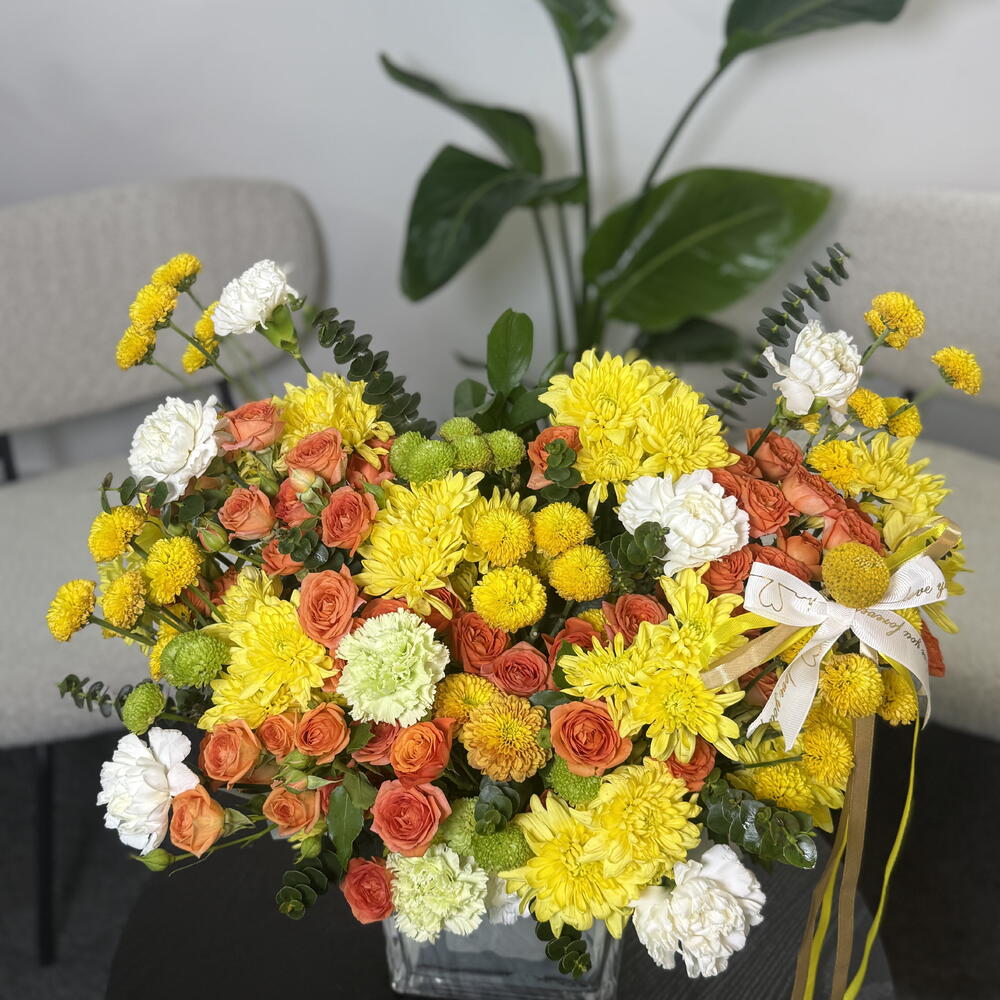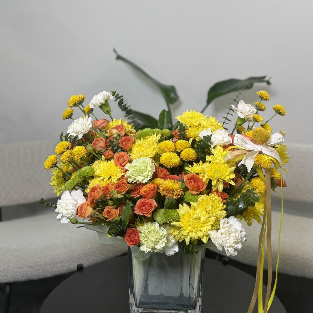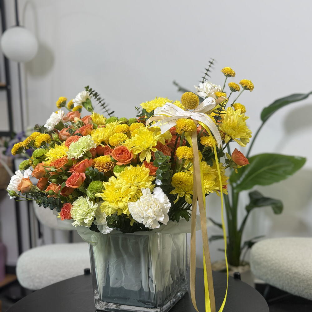 Это яркая, жизнерадостная цветочная композиция в прозрачной квадратной стеклянной вазе. Она включает в себя живую смесь желтых хризантем, кустовых роз теплых оранжевых оттенков, белых гвоздик и зеленых хризантем, дополненных желтыми шаровидными соцветиями и свежей зеленой зеленью. Композиция имеет пышную, садовую форму, сбалансированную по высоте и текстуре, и украшена мягкой лентой, которая добавляет нотку элегантности. В целом, она создает солнечное, теплое и воодушевляющее настроение, идеально подходящее для праздников, поздравлений или для того, чтобы привнести радостные краски в любое пространство 🌼🧡
