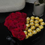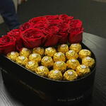 потрясающая коробка в форме сердца, разделённая на две идеальные половины — с одной стороны наполненная пышными, насыщенно-красными розами, символизирующими страсть, а с другой — золотыми конфетами Ferrero Rocher для нотки роскоши. Выполненная в стильной чёрной коробке с элегантной лентой, эта композиция — прекрасное выражение любви, гармонии и сладкого романтизма — идеально подходит для годовщин, Дня святого Валентина или трогательных сюрпризов