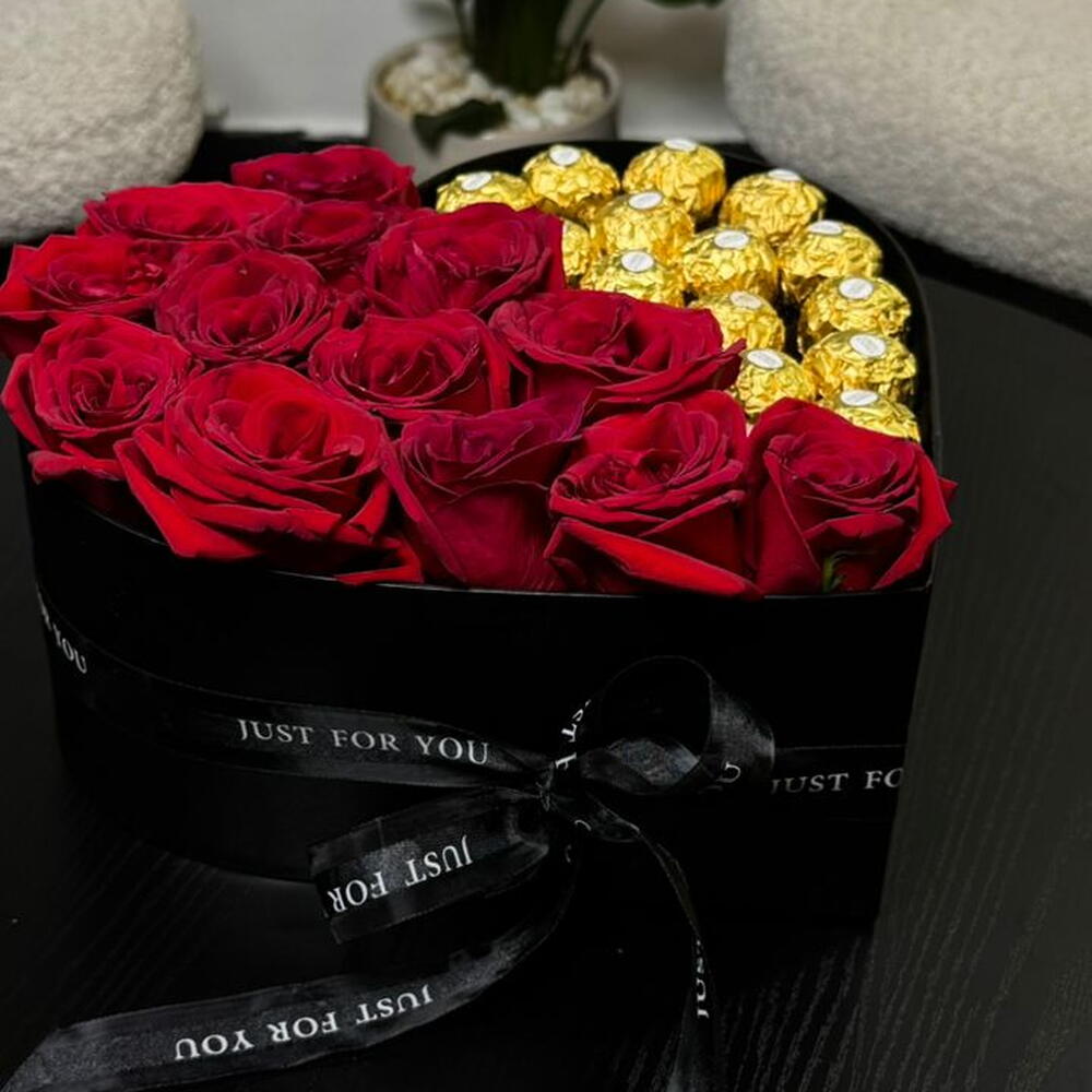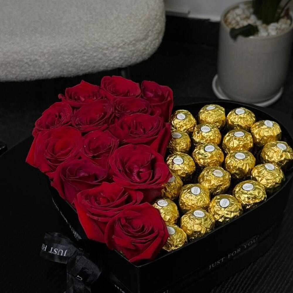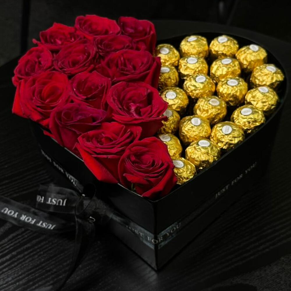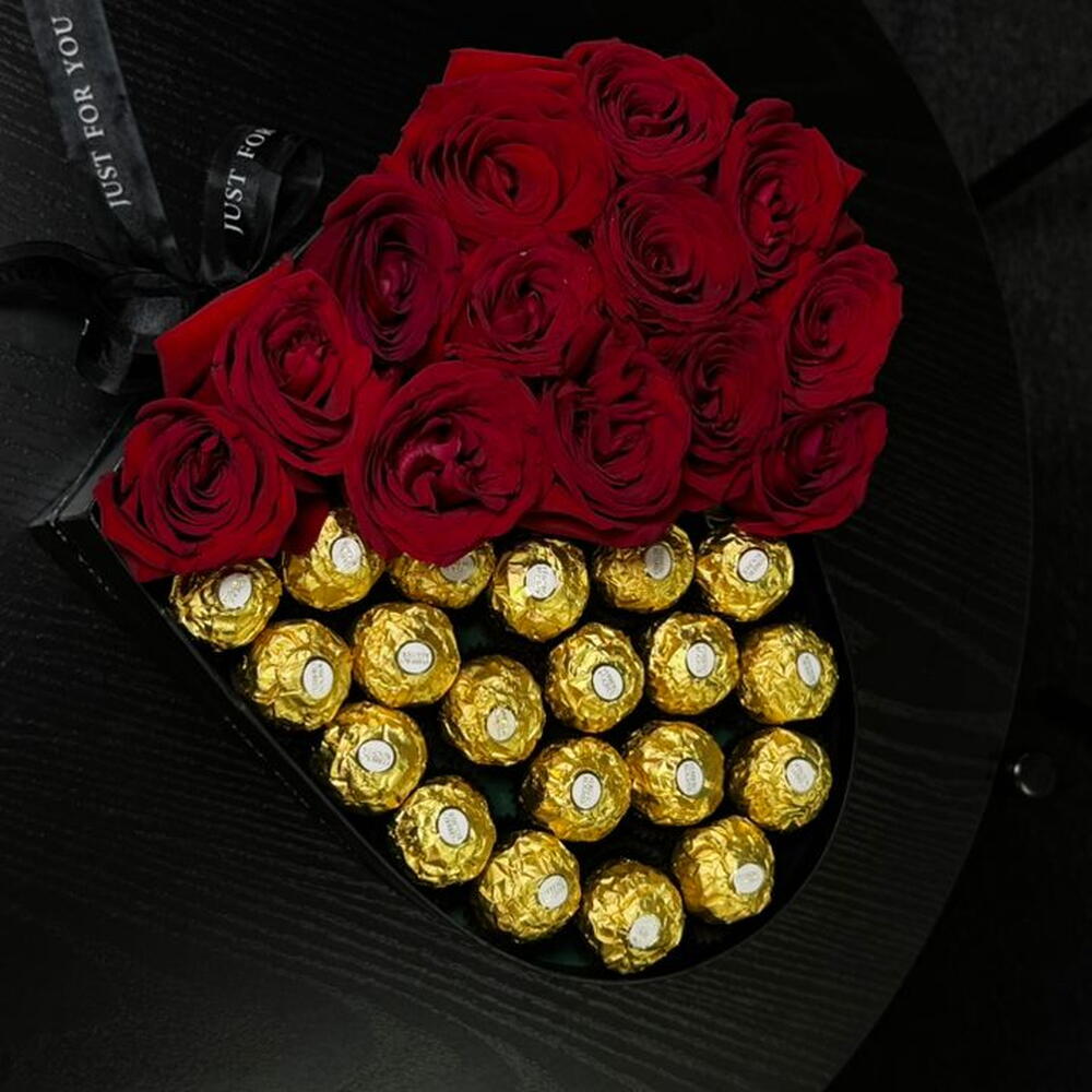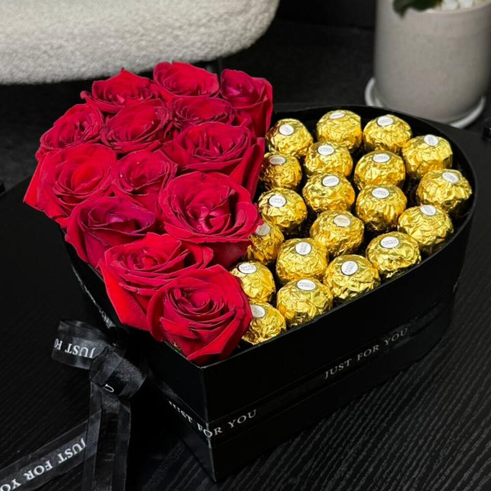 потрясающая коробка в форме сердца, разделённая на две идеальные половины — с одной стороны наполненная пышными, насыщенно-красными розами, символизирующими страсть, а с другой — золотыми конфетами Ferrero Rocher для нотки роскоши. Выполненная в стильной чёрной коробке с элегантной лентой, эта композиция — прекрасное выражение любви, гармонии и сладкого романтизма — идеально подходит для годовщин, Дня святого Валентина или трогательных сюрпризов