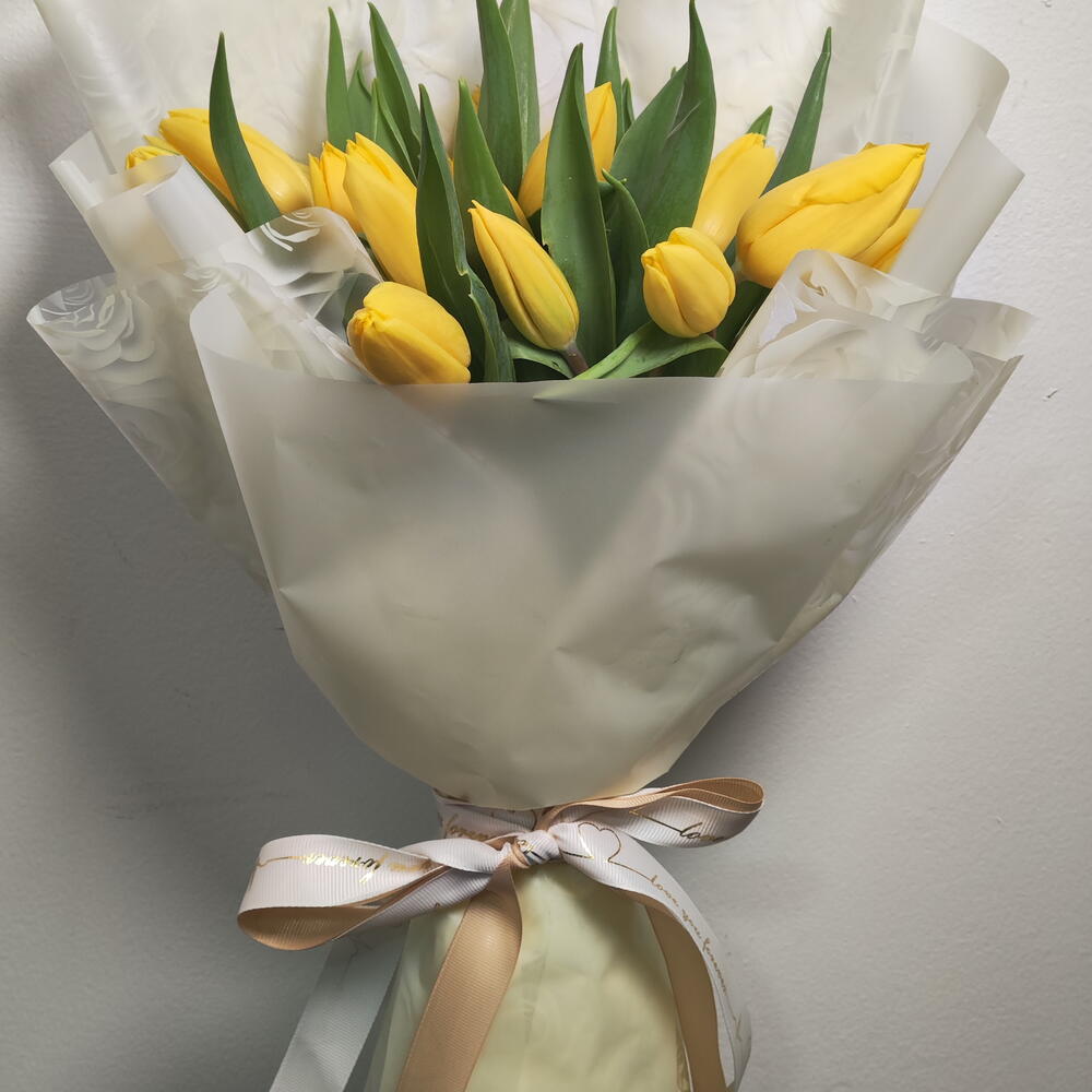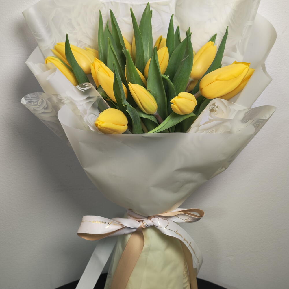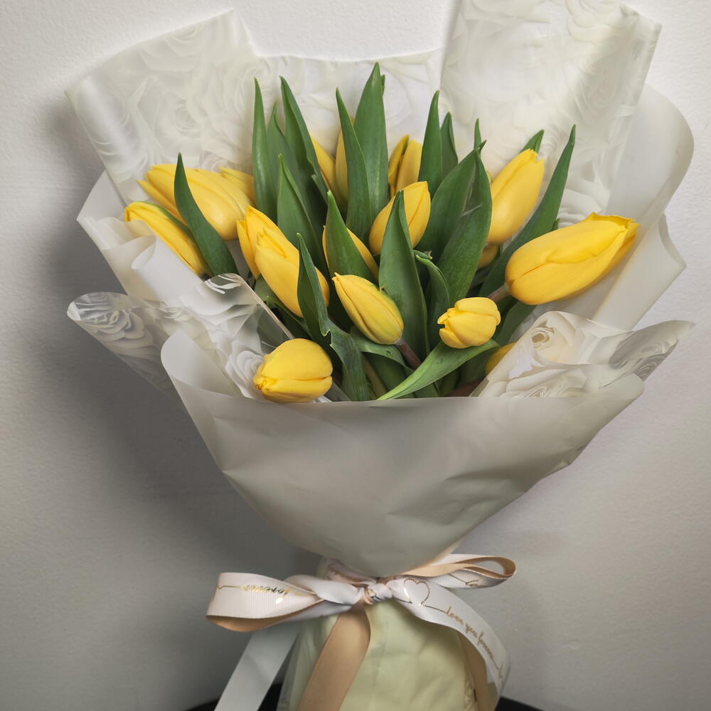Нежная и элегантная композиция из мягких жёлтых тюльпанов, красиво оформленная в современной прозрачной цветочной сумке. Нежные румяные лепестки символизируют привязанность, счастье и нежное восхищение, а гладкая прозрачная упаковка подчёркивает природную красоту цветов. Украшенная струящимися розовыми и белыми лентами, эта очаровательная композиция предлагает изящный и современный вид—идеально подходит для дней рождения, романтических жестов, празднования рождения ребёнка или просто чтобы скрасить чей-то день с ноткой мягкой элегантности.