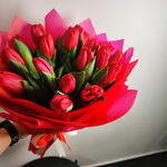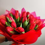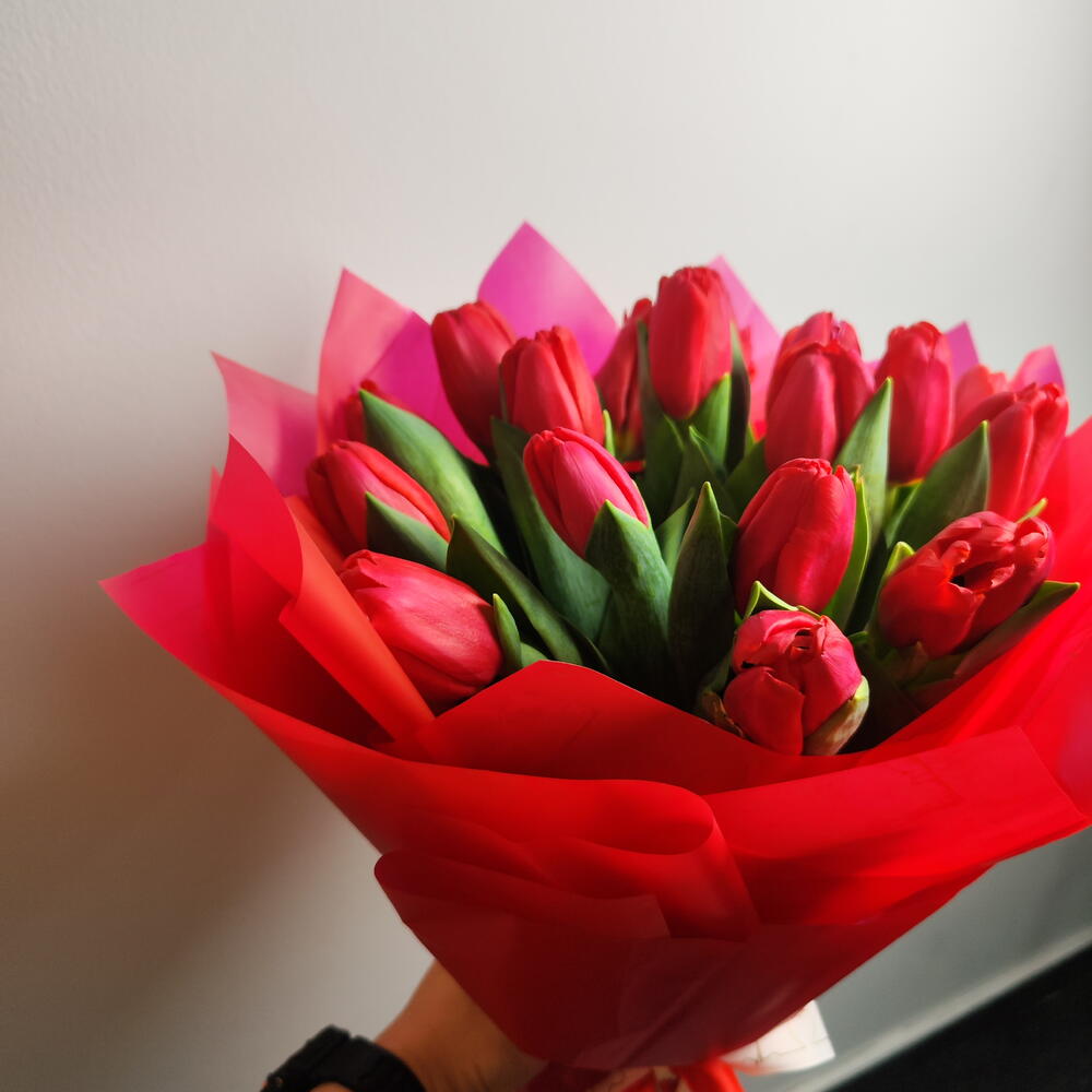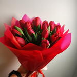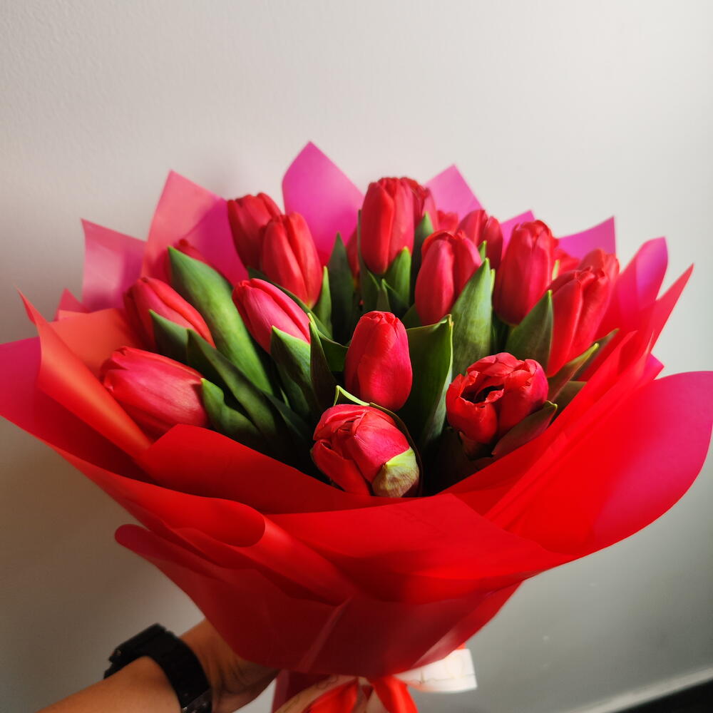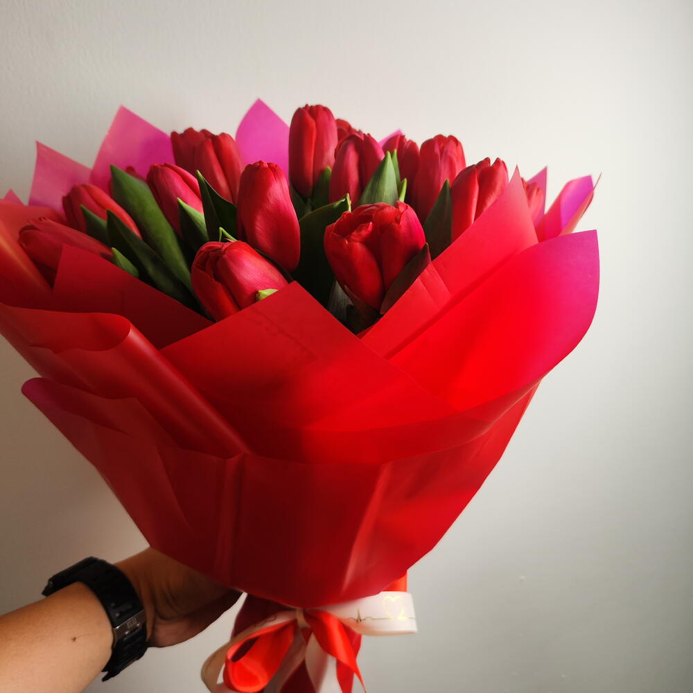 Эффектный букет из свежих красных тюльпанов, обернутый в элегантные многослойные оберточные бумаги ярких красных и розовых оттенков. Насыщенные малиновые цветы символизируют глубокую любовь, страсть и восхищение, а пышные зеленые листья создают естественный контраст, подчеркивающий их красоту. Букет, перевязанный изящной лентой, создает смелый, но в то же время грациозный образ — идеально подходит для романтических случаев, годовщин или для выражения искренних чувств.