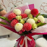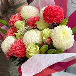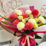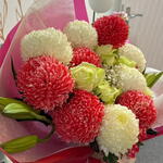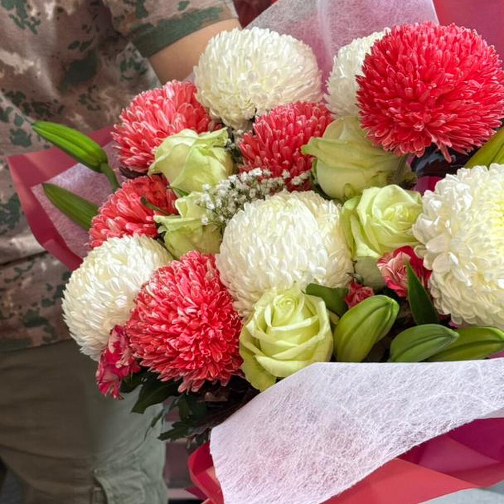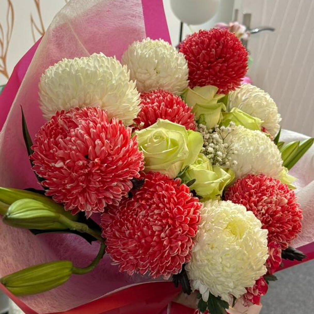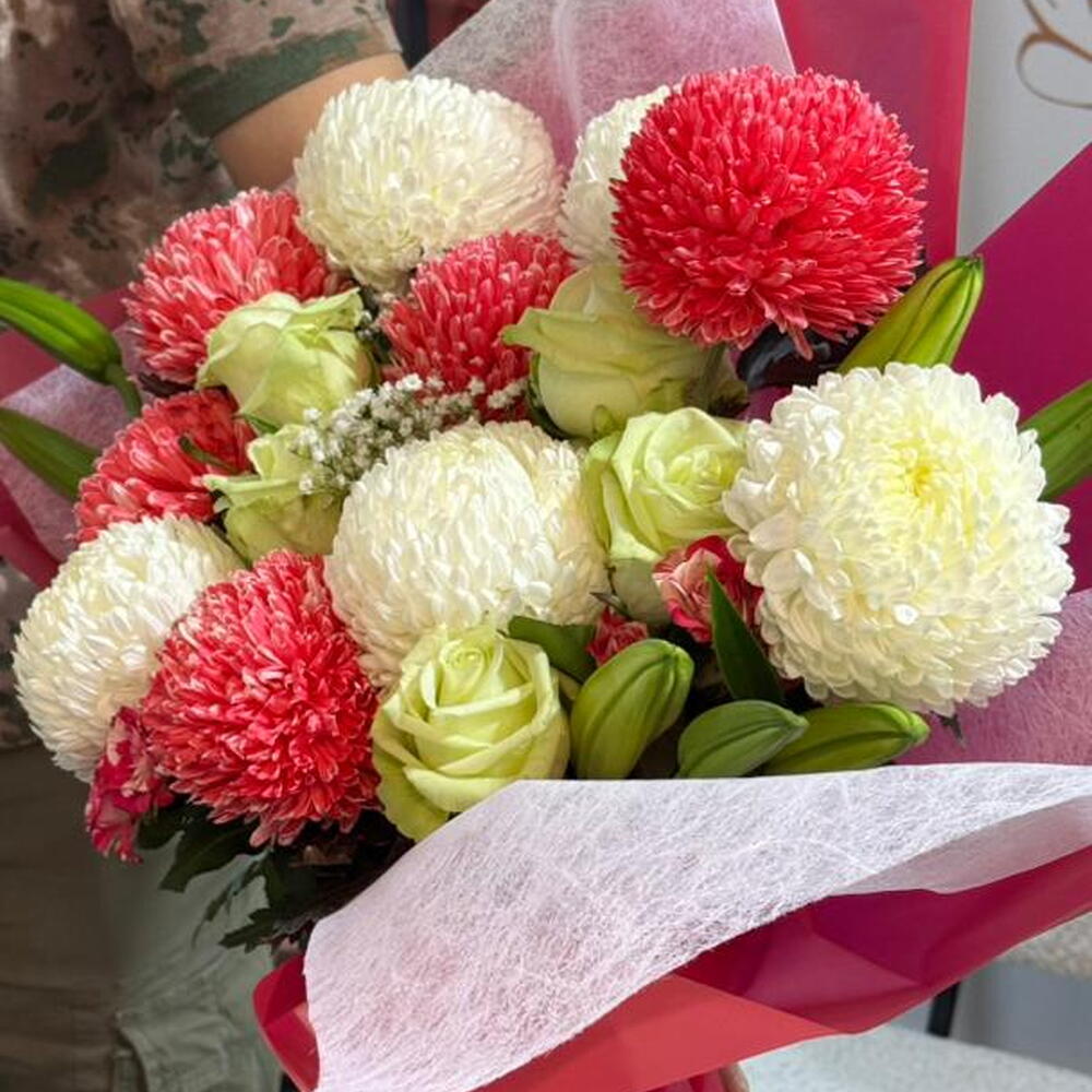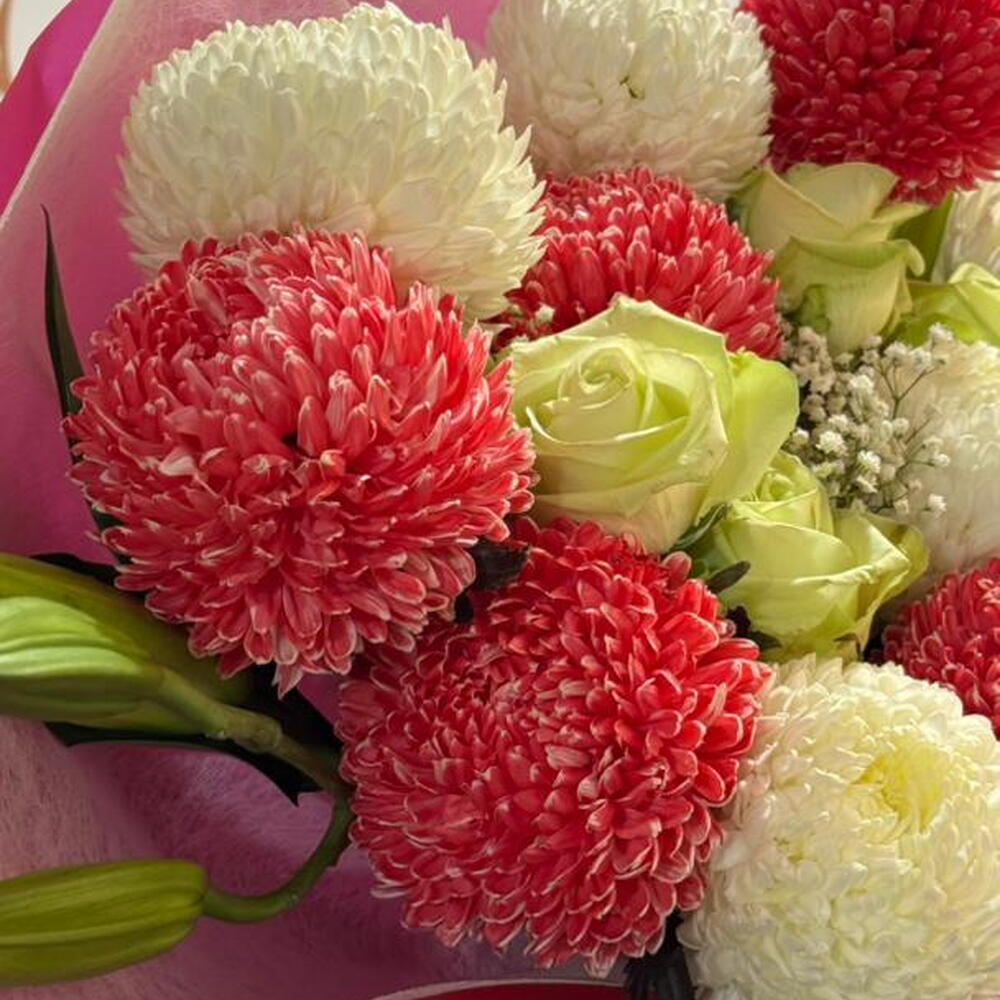 Весёлый и элегантный букет с пушистыми красными и кремовыми помпонными хризантемами в сочетании со свежими зелёными розами и нежными мелкими цветами. Завёрнутый в мягкие розовые слои и украшенный подходящей лентой, этот букет излучает тепло, радость и нежную привязанность — идеально подходит для дней рождения, поздравлений или для милого жеста «думаю о тебе» 🌸✨