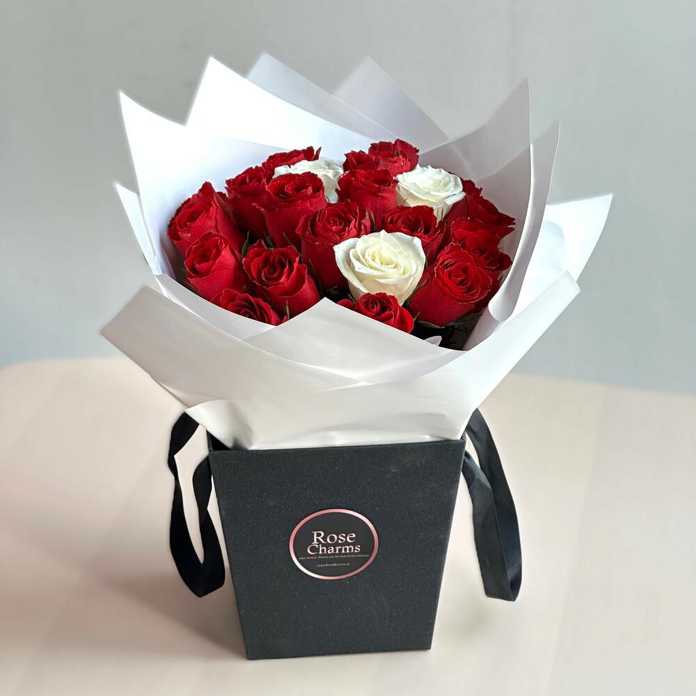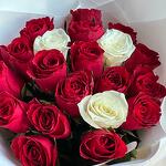 неподвластная времени композиция из 18 сияющих красных роз и 3 элегантных белых роз, завернутая в плотную белую бумагу и красиво оформленная в стильном пакете