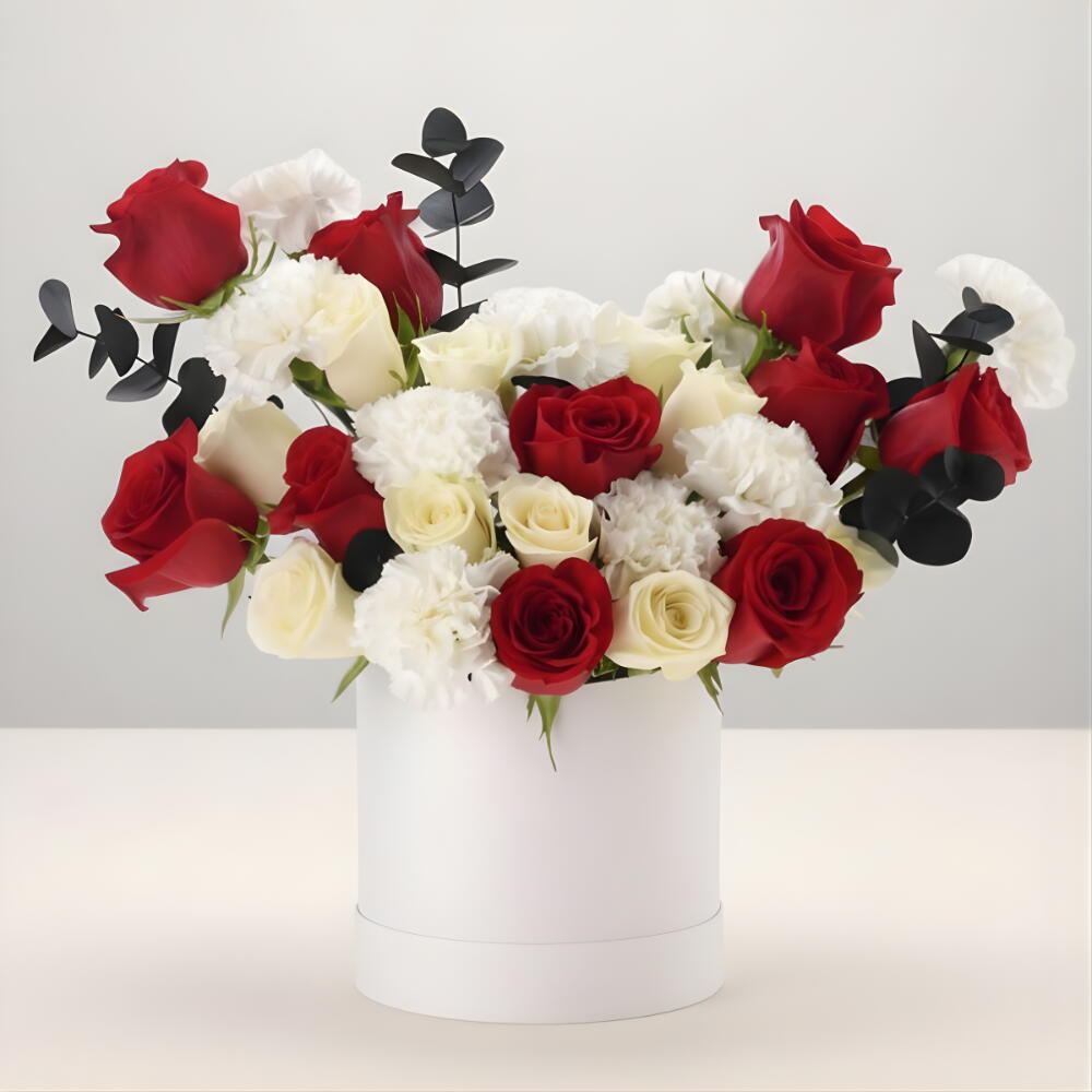 Arrangement of 20 red and white roses , 8 white carnation with fillers in a white box (Facing Arrangement). Elegant facin g arrangement of 20 red and white roses paired with 8 white carnations, beautifully styled with fresh fillers in a premium white box—perfect for classy and heartfelt gifting. red roses, white roses, white carnations, flower box, facing arrangement, elegant flowers, romantic gift, premium floral box Keep flowers in a cool place away from sunlight, change water daily, trim stems regularly, remove wilted parts, and avoid heat or AC exposure.