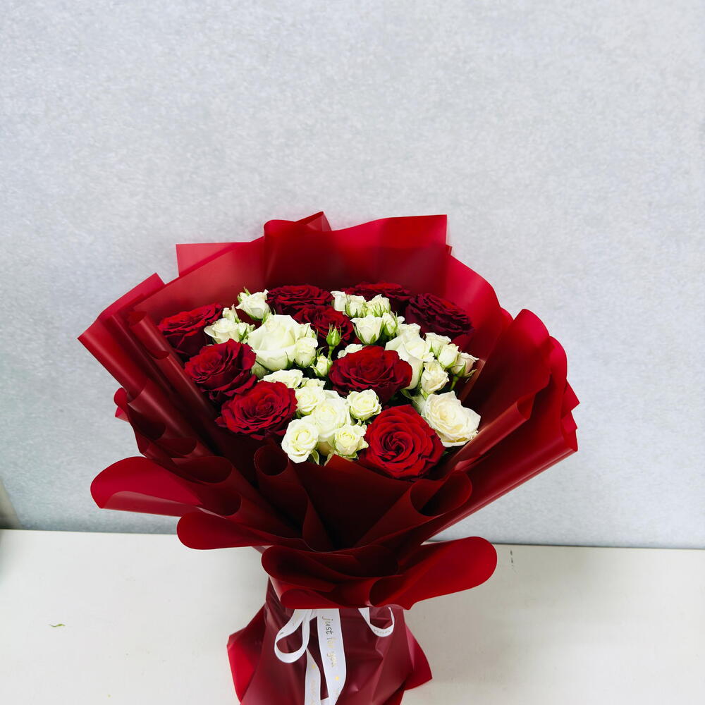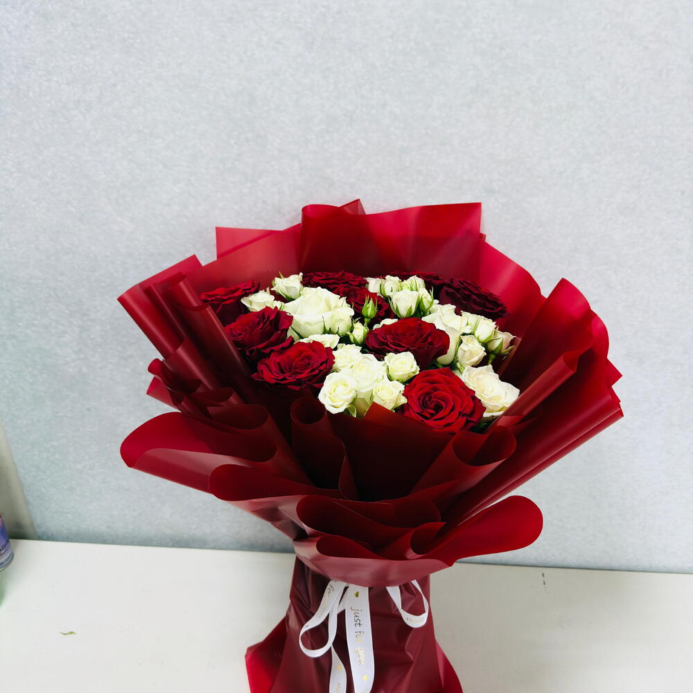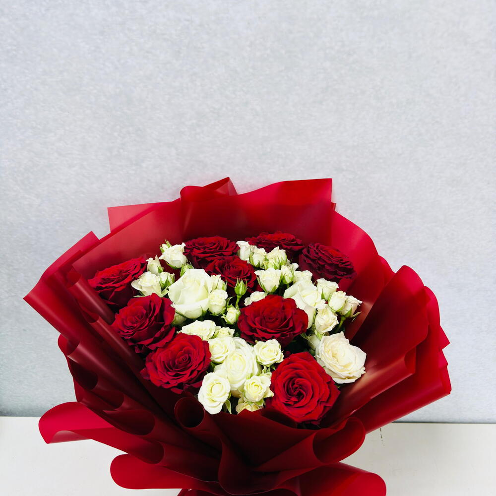 Побалуйте себя поразительным очарованием этого вручную собранного букета из нашей категории Florists Specials. С любовью составленный из девяти роскошных красных роз, он шепчет о романтике и страсти. Акцентированный шестью очаровательными белыми мини-розами и тремя величественными белыми розами, этот букет олицетворяет чистую элегантность и любовь в ее высшей форме. Все эти потрясающие цветы изящно укутаны в шесть листов тщательно отобранной упаковочной бумаги и украшены изящной ленточкой. Это поистине вечная классика, готовая покорять сердца своими яркими оттенками и исключительной красотой.