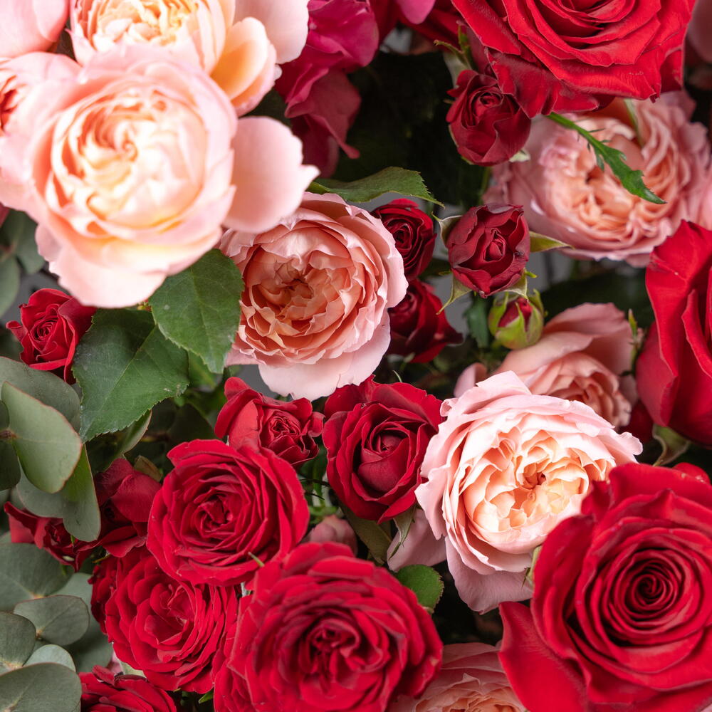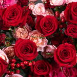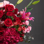Alstroemeria - 3 шт. розовая лилия - 1 шт. красная кустовая роза - 7 шт. гиперикум красный - 6 шт. кустовая роза Джульетта - 9 шт. красная гортензия - 2 шт. red roses - 9 шт.