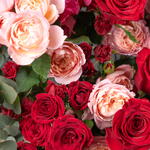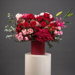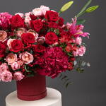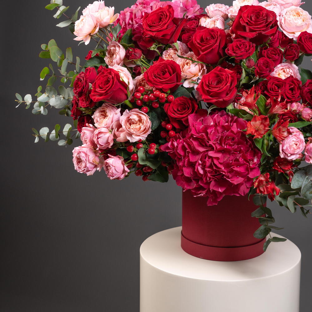 Откройте для себя экстравагантную красоту нашей эксклюзивной композиции «Цветы в коробке» с великолепной композицией из ярких цветов. В коробке 3 альстромерии, которые дополняют композицию своим тропическим очарованием, – величественно возвышается одинокая розовая лилия, добавляя нотку элегантности, а 6 игривых красных гиперикумов – яркий акцент. Центр композиции составляют 9 тонко ароматных кустовых роз сорта «Джульетта», неотразимых в своих нежных оттенках. Их гармонично дополняют 7 темно-красных кустовых роз, создающих страстный контраст, 2 пышные красные гортензии, создающие драматизм и глубину, и, наконец, 9 изысканных красных роз, завершающих букет классическим шиком. Эта цветочная коробка – воплощение элегантности, очарования и страсти, что делает ее идеальным подарком для любимого человека или подарком себе.