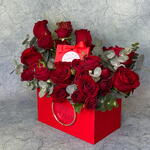 Red rose - 9 шт. red spray rose - 3 шт. red box - 1 шт. подарочный пакет - 1 шт. красная коробка с 4 шоколадными конфетами ассорти - 1 шт.