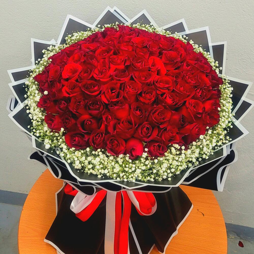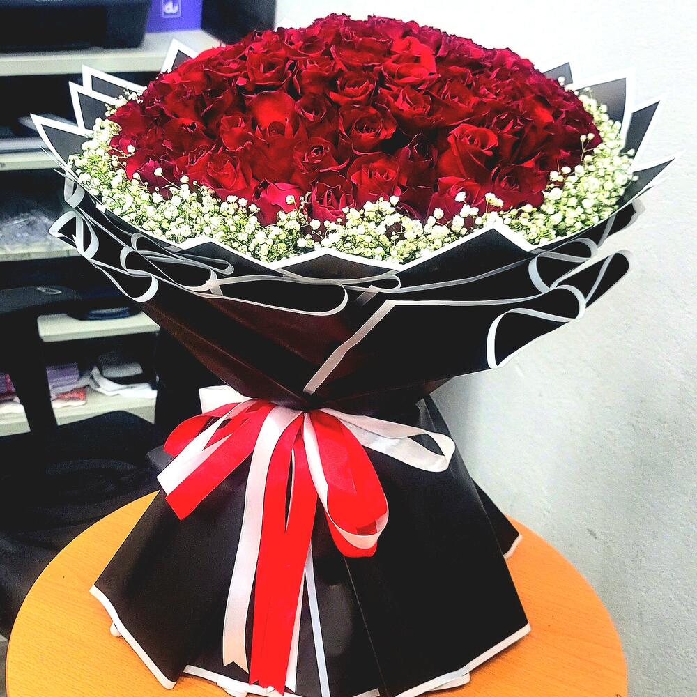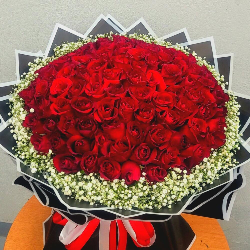 красный ленточный бант - 1 шт. red roses - 101 шт. стебель гипсофилы - 12 шт. чёрный с белым покрытием - 12 шт.