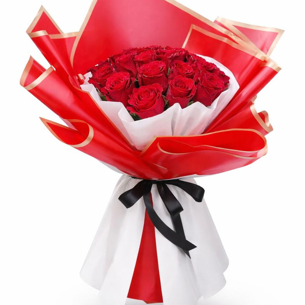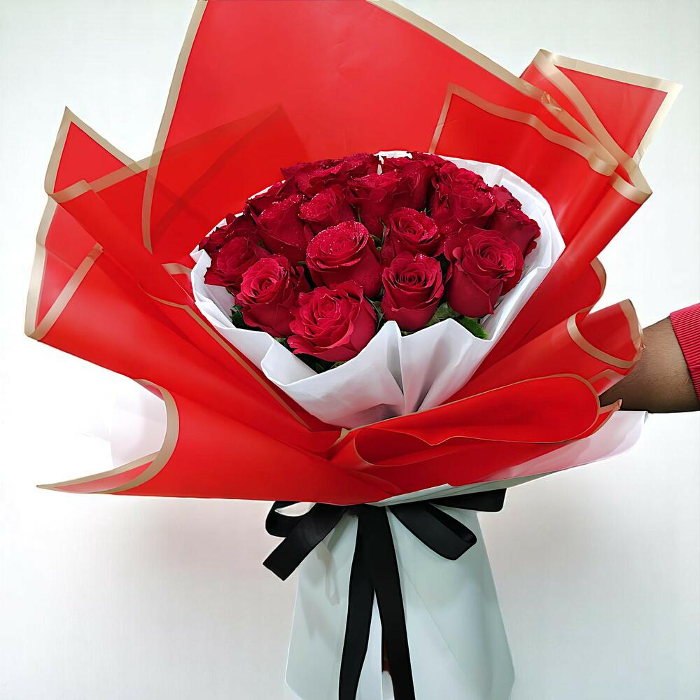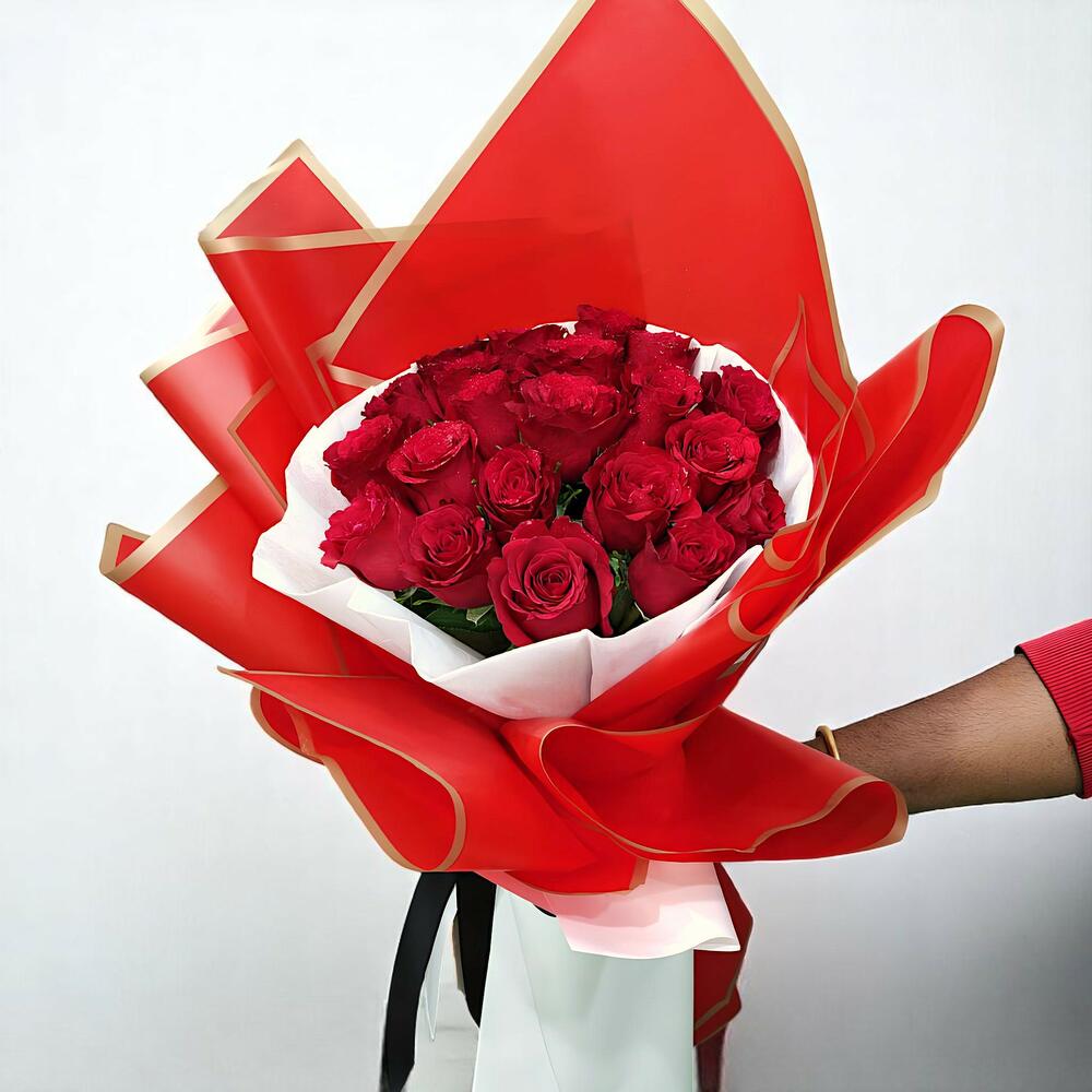 Элегантный и неподвластный времени, этот потрясающий букет красных роз, завернутый в яркую красно-золотую бумагу, — идеальный жест любви и восхищения. 🌹✨