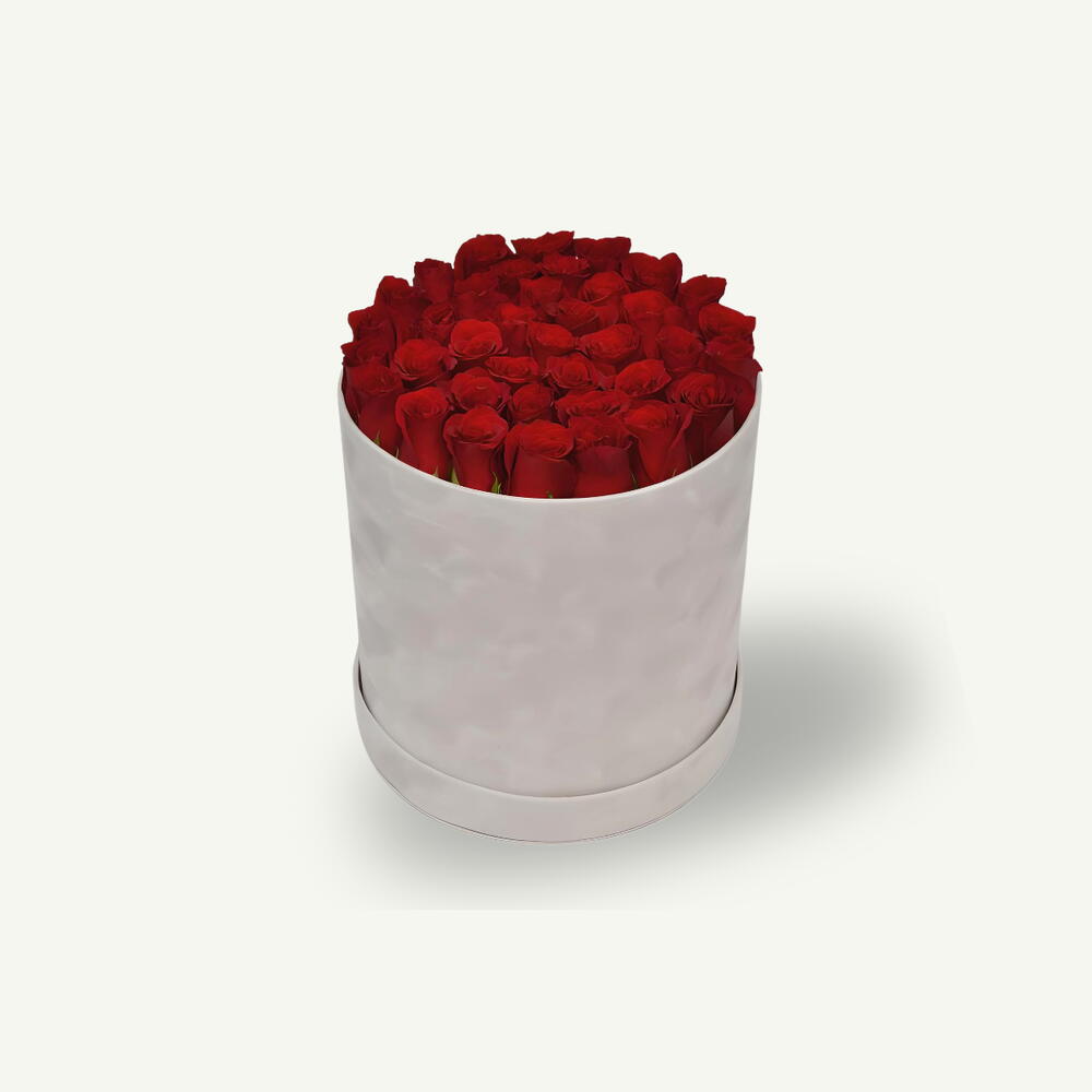 Изящная композиция из 25–30 свежих красных роз, красиво оформленная в белой коробке для элегантного и вневременного жеста.