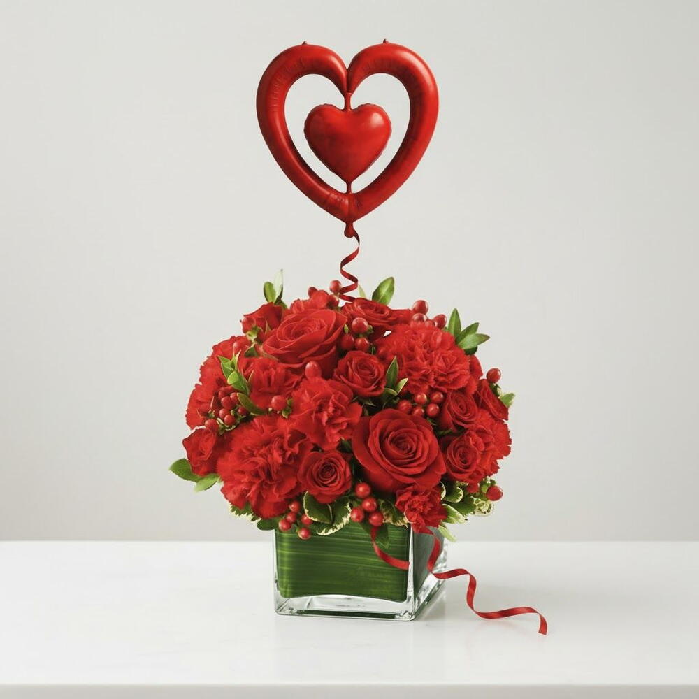 Поразительное сочетание страсти и нежности — эта композиция сочетает в себе 8 ярких красных гвоздик, 7 насыщенно-красных роз и 2 пышных гиперикума, изящно оформленных в современную квадратную стеклянную вазу. Вверху парит красный воздушный шар в форме сердца диаметром 107 см, наполненный гелием, смелый и полный эмоций — тот самый жест, который не шепчет о любви, а громко и уверенно заявляет о ней. Это сочетание идеально подходит для годовщин, романтических сюрпризов, извинений, которые нужно сделать мягко, или просто дней, когда вы хотите напомнить кому-то особенному, что ваше сердце бьется для него. Классические цветы, вечная символика и игривое очарование поколения Z — все в одном незабываемом подарке. Подарите любовь сейчас — зажгите их сердца уже сегодня. Закажите этот потрясающий набор из вазы и воздушного шара в форме сердца, и пусть ваши чувства взлетят до небес.