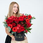 красная альстромерия - 5 шт. red roses - 5 шт. гермини красный - 5 шт. гортензия окрашенная в красный - 2 шт. спрей-роза mirabel красная - 3 шт.