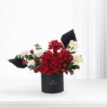 Эта утончённая композиция включает 5 красных роз, символизирующих глубокую привязанность, в сочетании с 2 белыми розами, олицетворяющими чистоту и грацию. В ней акцент сделан на 3 белых гвоздиках для мягкости, 5 красных кустовых роз для пышности, 3 веточках эвкалипта и 6 листьях рускуса для природной свежести, она излучает тепло, элегантность и вечное очарование. Доступно в чёрной коробке