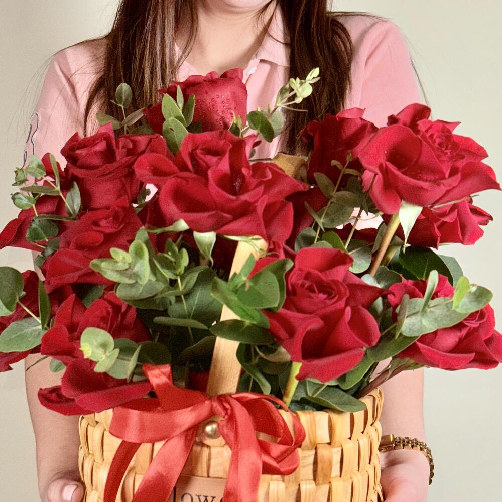 Смелая и вечная корзина с красными розами, переполненная свежими красными розами (Rosa) и дополненная пышной эвкалиптовой зеленью — премиальная корзина с цветами, которая выглядит роскошно, романтично и естественно стильно. Идеально в качестве букета на день рождения и один из лучших вариантов праздничных букетов, она идеально подходит как цветы на день рождения / цветы для дня рождения и для незабываемых подарков на день рождения. Цветы, включённые в дизайн: красные розы (Rosa) + эвкалипт (зелень). Этот элегантный букет роз в корзине также является потрясающим романтическим букетом для любви и романтики, изысканным букетом для поздравлений и одним из лучших цветов на годовщину. Если вы ищете премиальный букет с цветами премиум-класса и лучший букет в Дубае, эта корзина с красными розами всегда в тренде и по-настоящему уникальна.