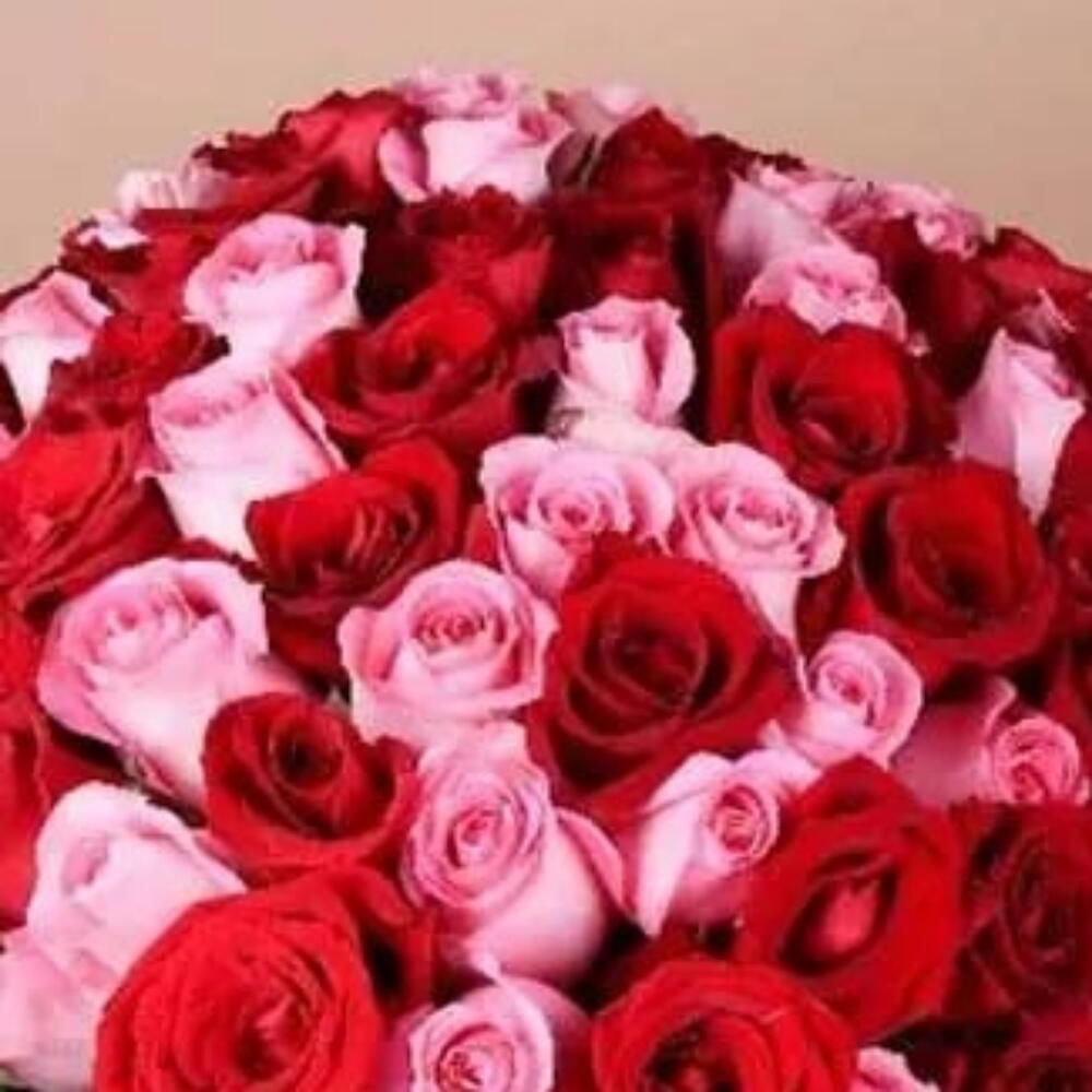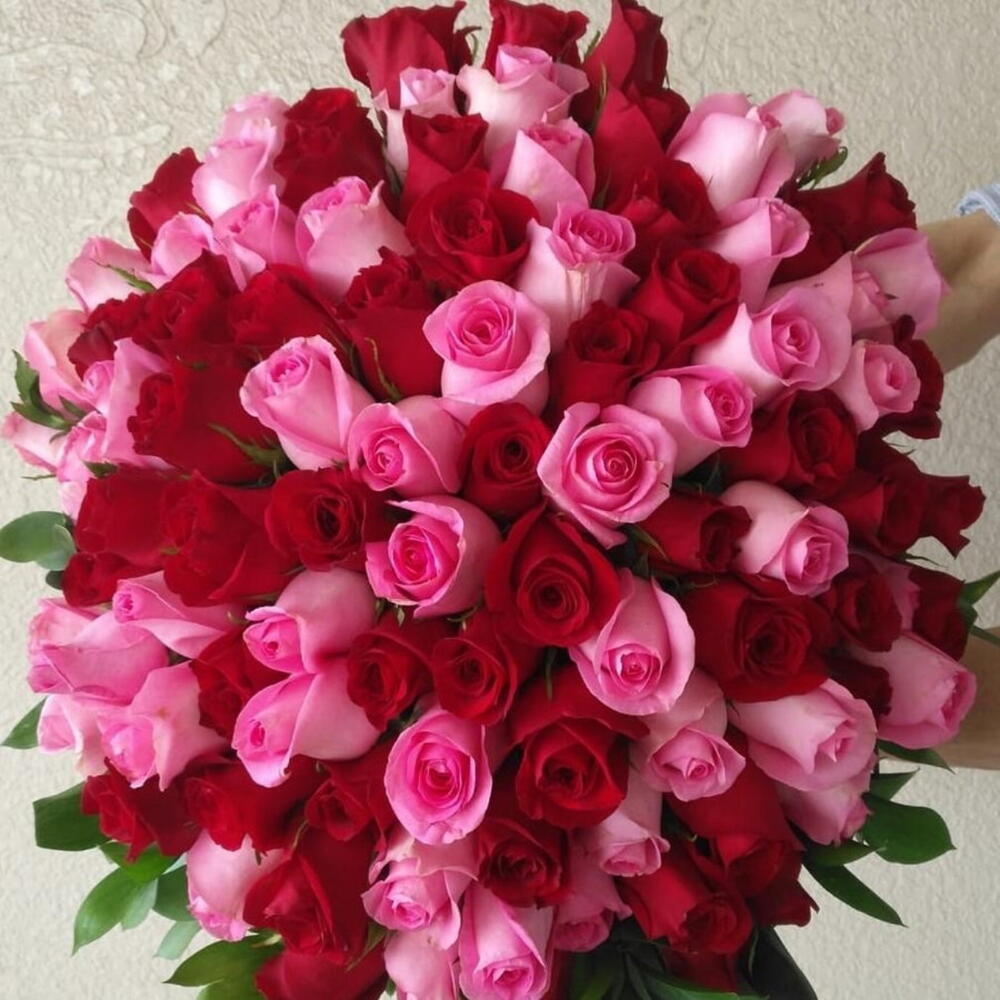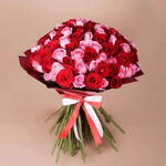 Red rose - 51 шт. Ribbon - 1 шт. Pink rose - 50 шт. Wrapping - 3 шт.