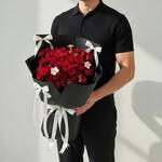 Элегантный букет свежих красных роз, завернутый в стильную черную бумагу с белыми лентами. Классический цветочный подарок для любви, юбилеев, дней рождения и особых случаев.