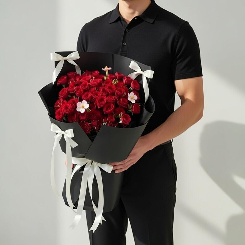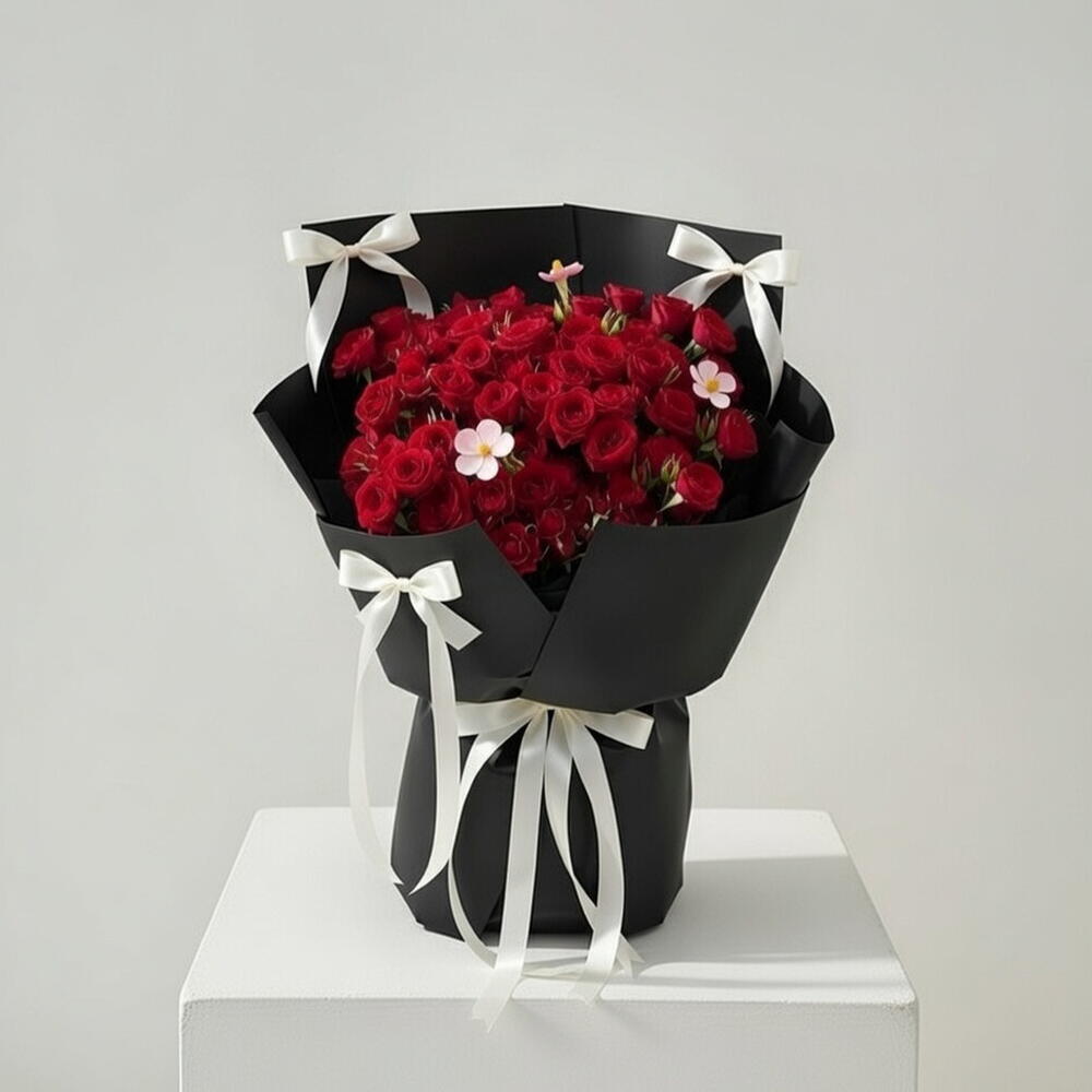 Элегантный букет свежих красных роз, завернутый в стильную черную бумагу с белыми лентами. Классический цветочный подарок для любви, юбилеев, дней рождения и особых случаев.