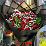 Red rose - 18 шт. Ruscus - 4 шт. гипс - 10 шт.