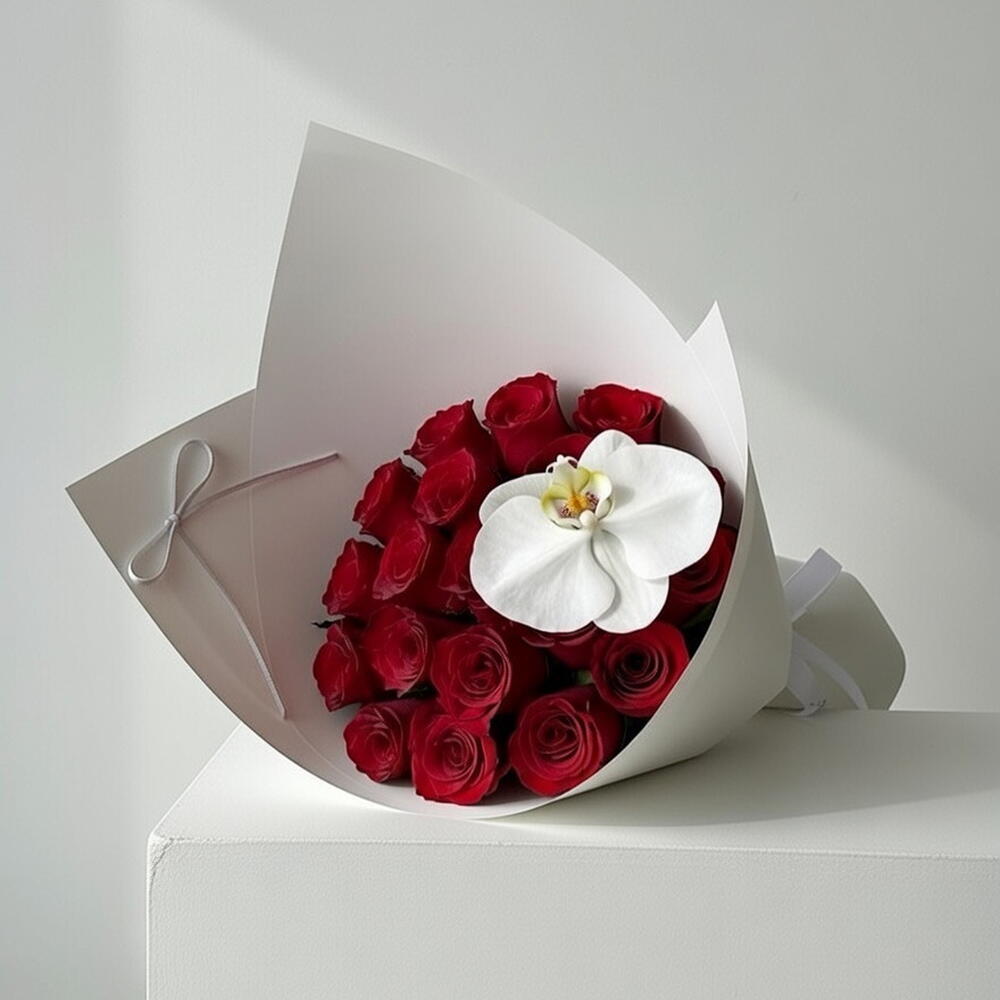 Элегантный букет свежих красных роз, дополненный белой орхидеей и завернутый в премиальную белую бумагу. Изысканный цветочный подарок для романтических поводов, годовщин и особых моментов.