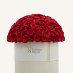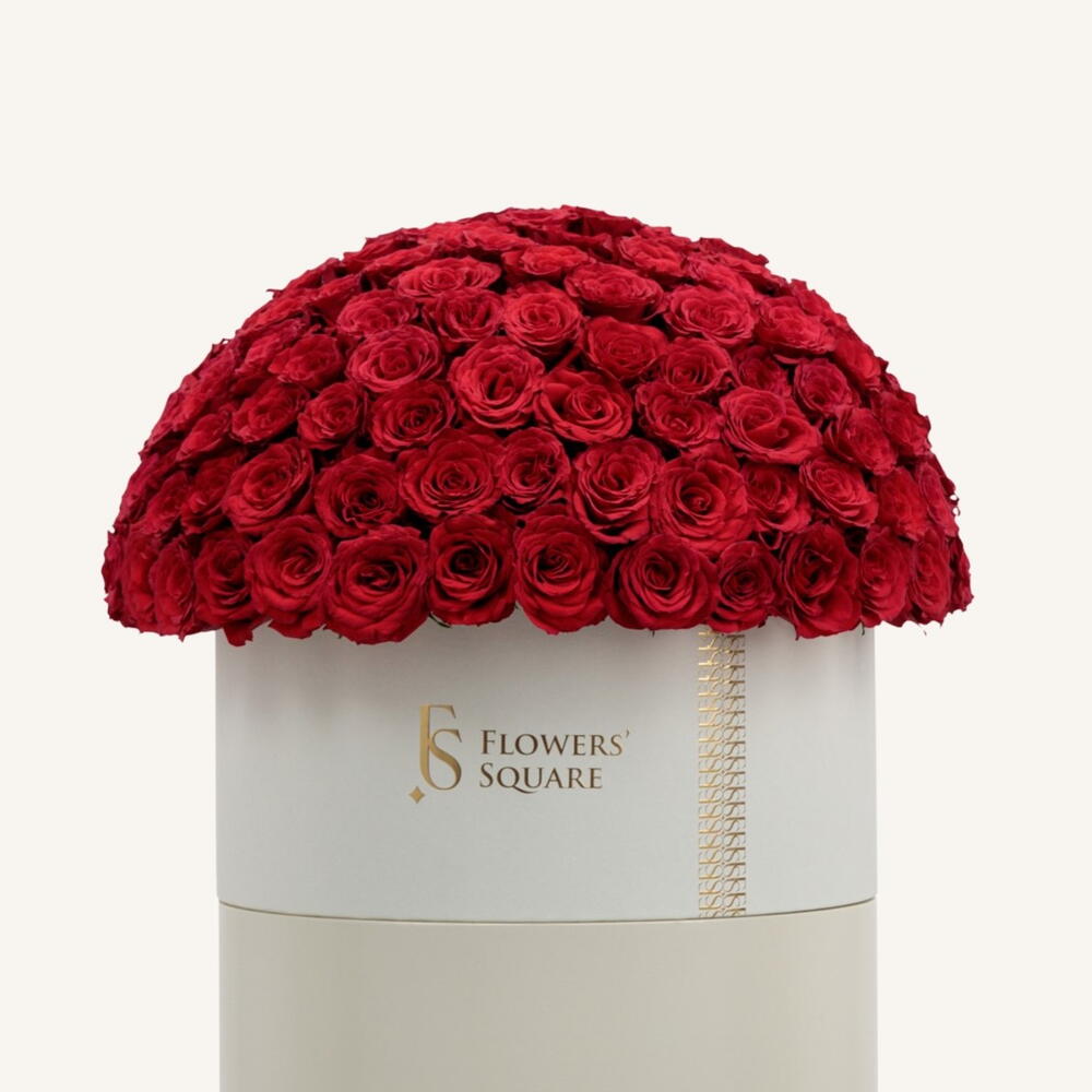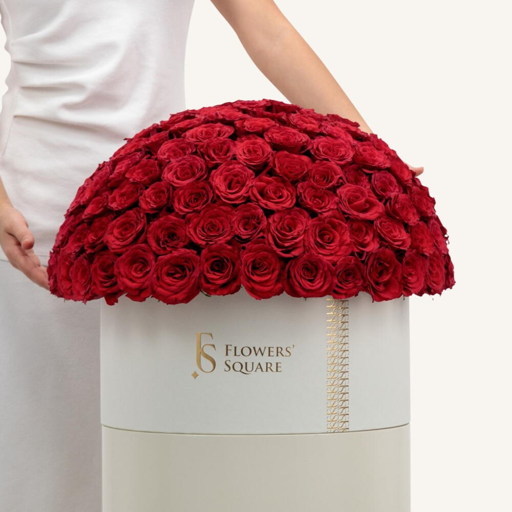 Коробка красных роз — очаровательная эйфория. Новая эра во флористике. -150 премиальных роз. - Высота: 50 см Ширина: 40 см