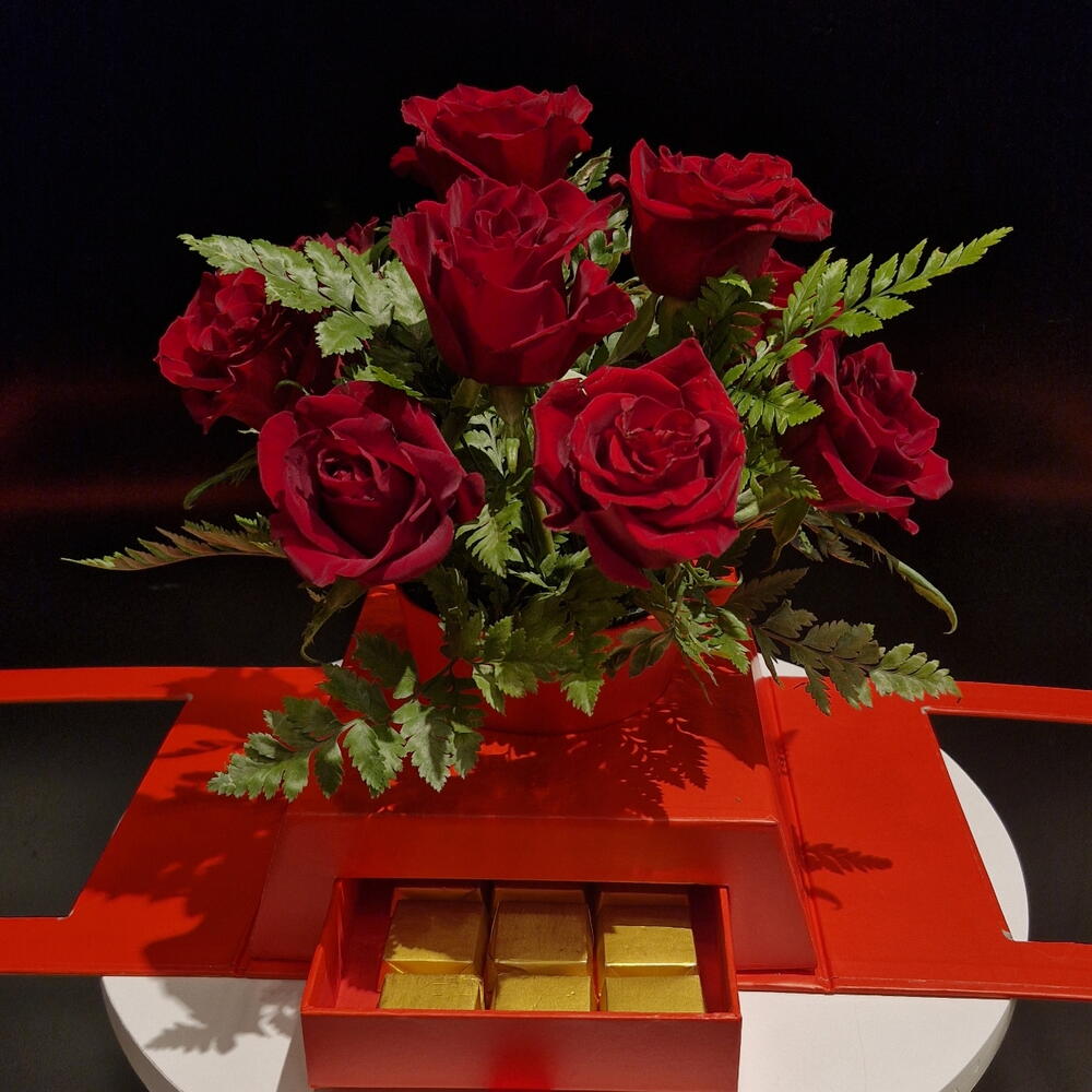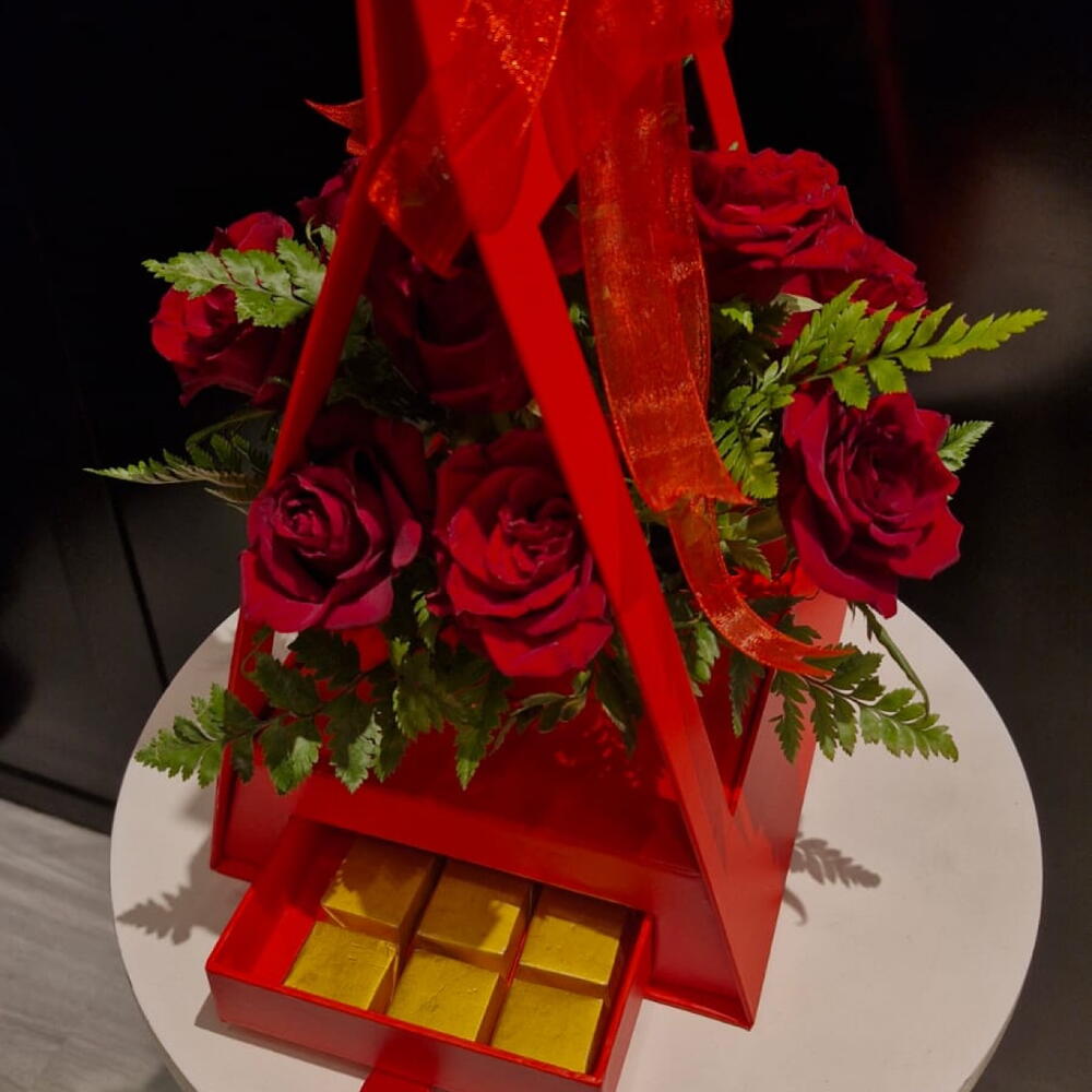 rose red - 10 шт. кожаный лист - 6 шт. шоколадные конфеты фисташки - 15 шт. красная коробка и блок в наличии - 1 шт.