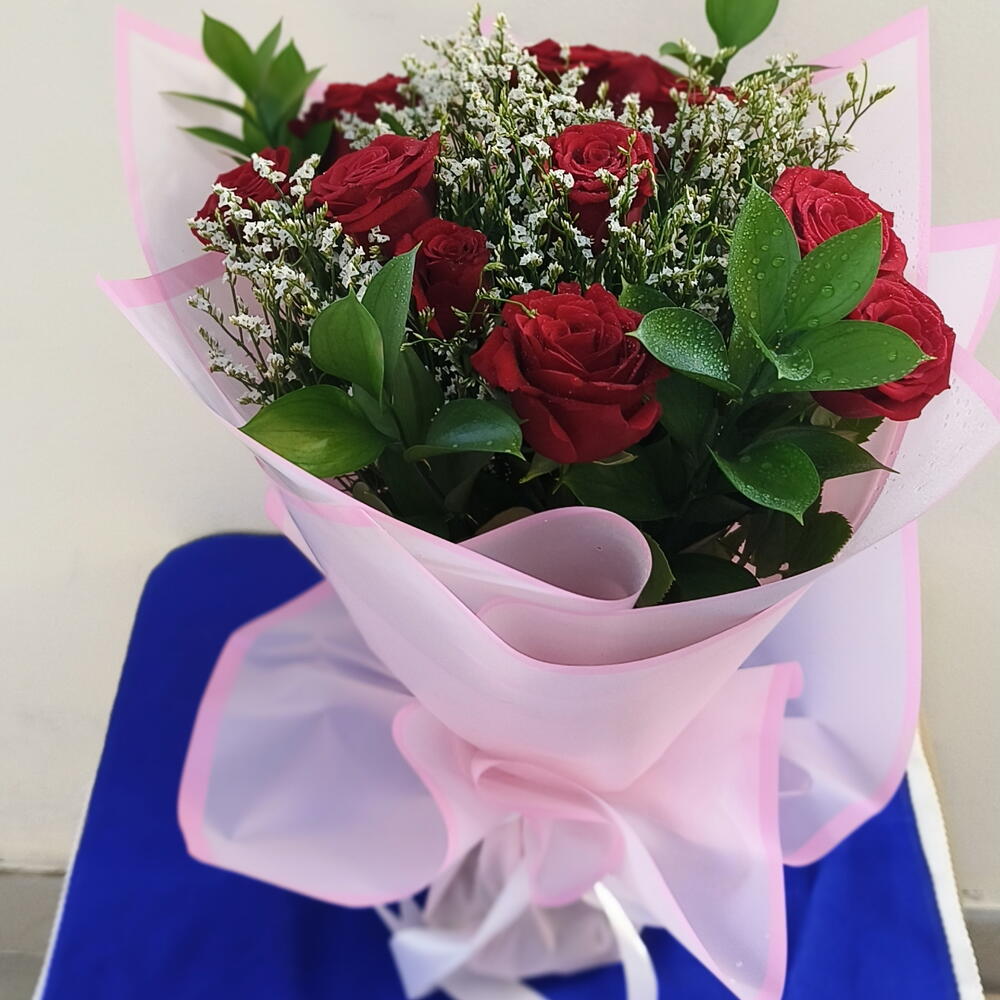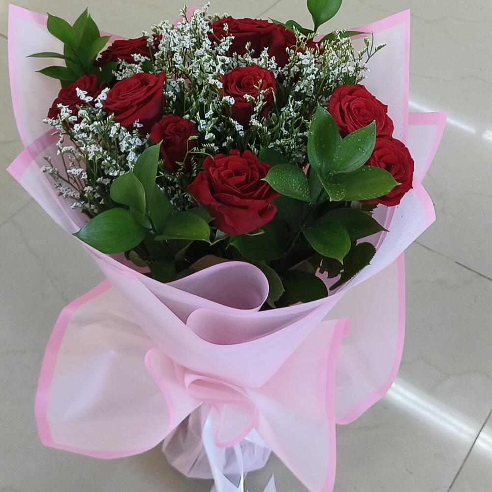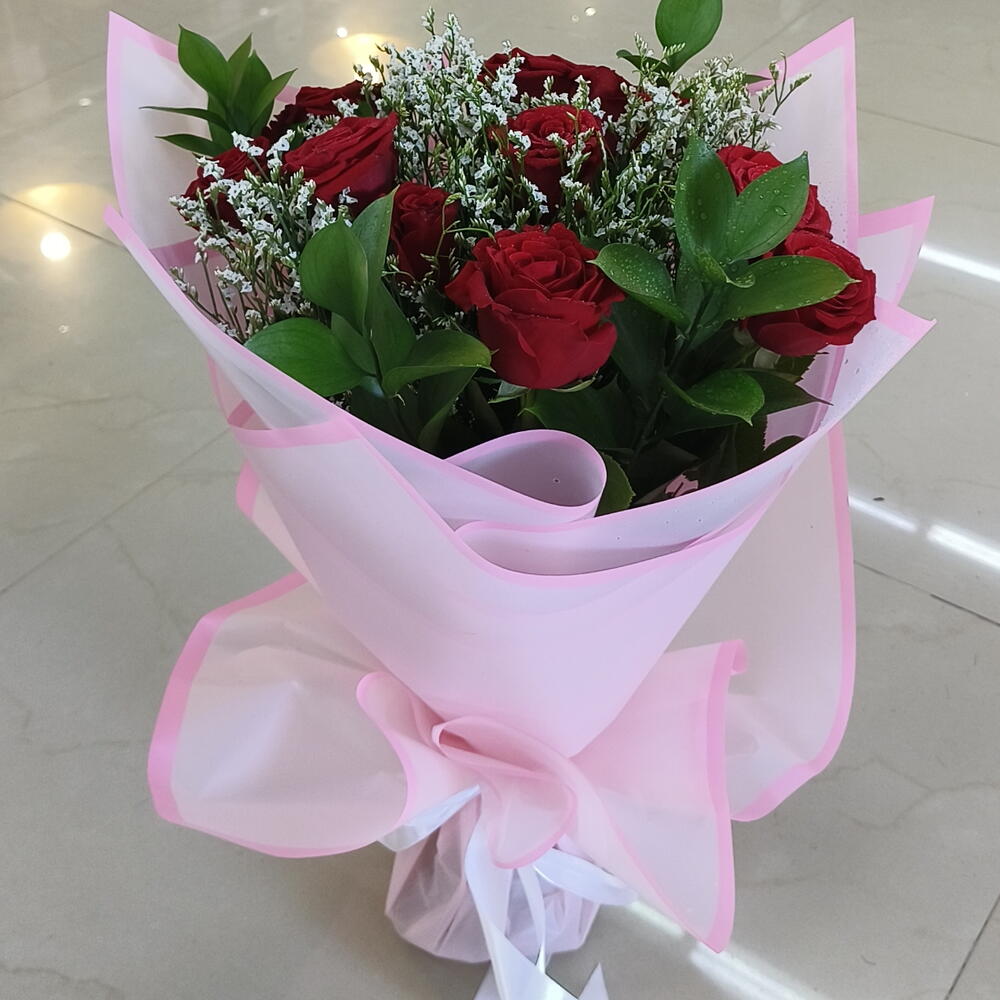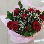 10 свежих роз в красивой розовой обёртке