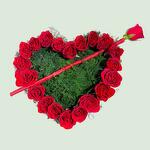 Поразительная цветочная композиция в форме сердца: пышная окантовка из ярко-красных роз окружает изумрудно-зелёную внутреннюю часть из нежной листвы. Одна красная роза, похожая на стрелу, пронзает центр, создавая мощный и романтичный символ любви и страсти.