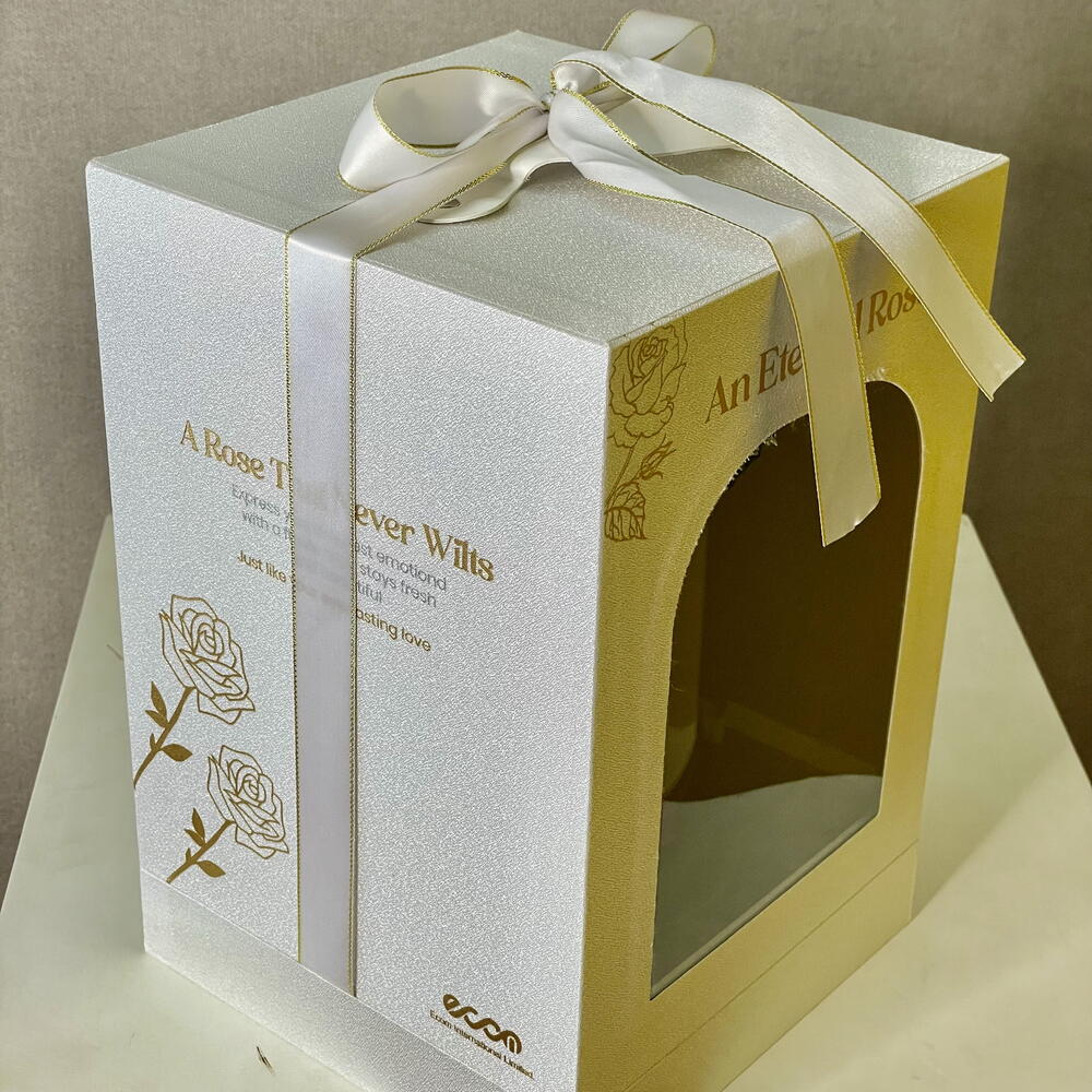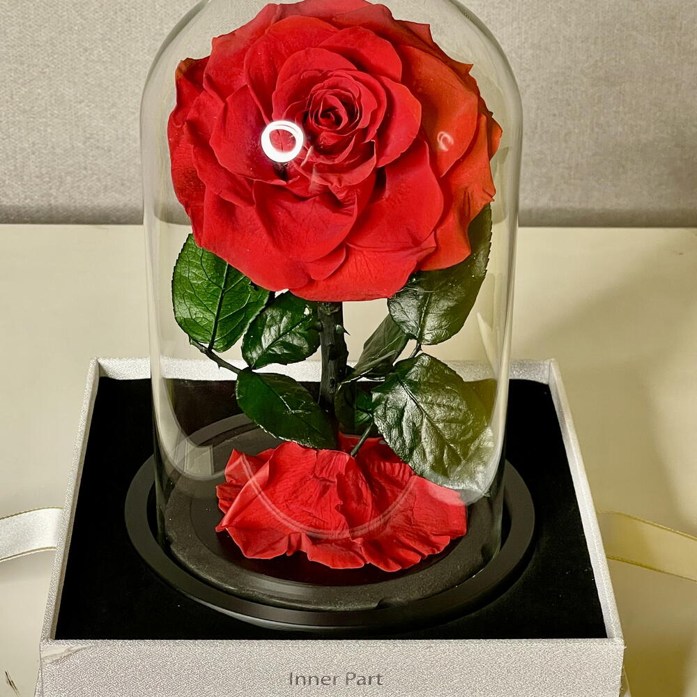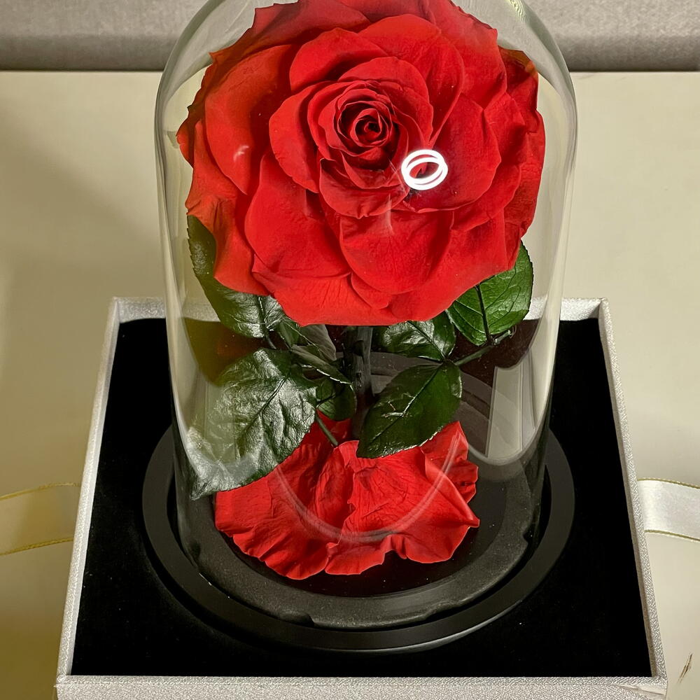 Одна стабилизированная роза красного цвета, изящно размещённая в стеклянном куполе и представленная в элегантной упаковочной коробке. Поставляется с сумкой для переноски, идеально подходит в качестве неувядающего и продуманного подарка.