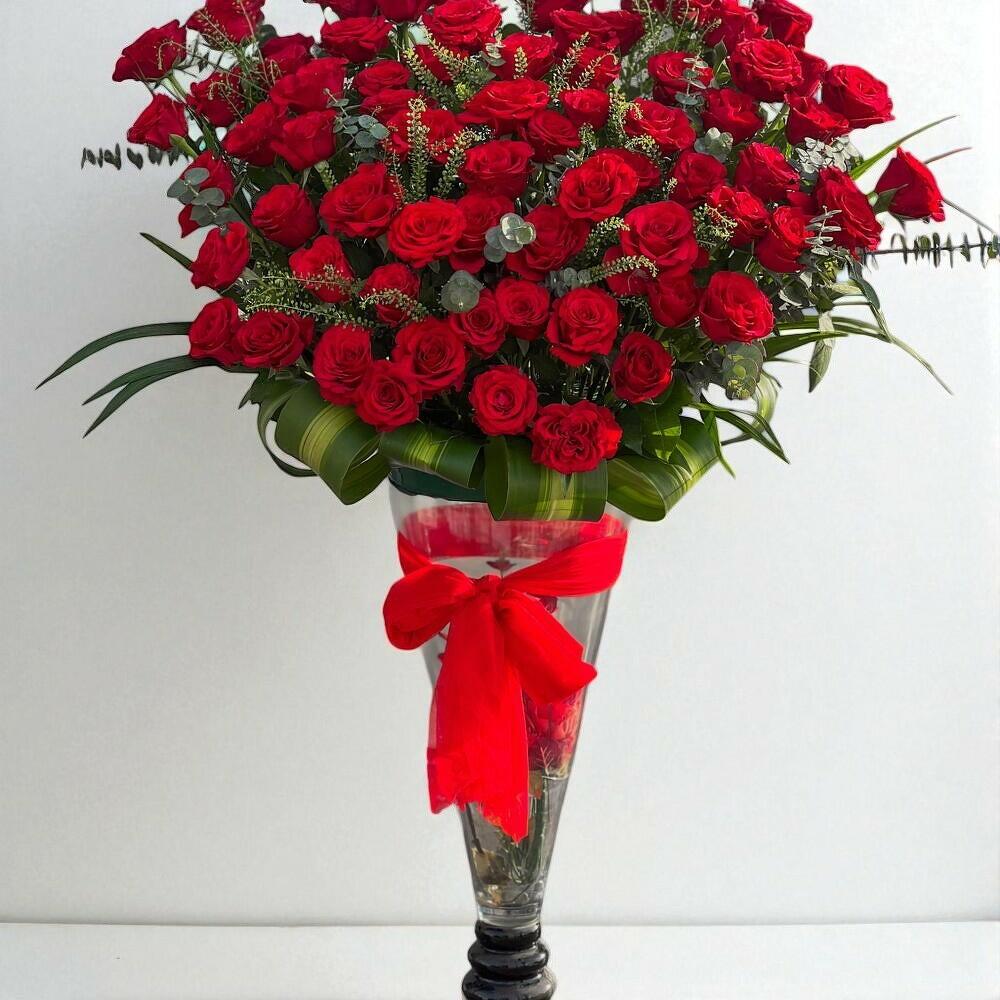Эта роскошная композиция из красных роз – потрясающее выражение страсти и элегантности. Каждый цветок тщательно отобран и искусно оформлен в высокой стеклянной вазе, перевязанной яркой красной лентой, которая добавляет нотку романтики. Насыщенные красные оттенки и пышная зелень делают этот букет эффектным центральным элементом для торжественных случаев или престижных мероприятий. Чтобы цветы оставались свежими, поместите их в прохладное место, защищенное от прямых солнечных лучей и сквозняков. Ежедневно наполняйте вазу свежей водой и слегка подрезайте стебли каждые два дня. Избегайте использования близкоспелых фруктов, чтобы продлить жизнь букета. Розы – главный символ любви и восхищения, что делает их идеальным выбором на День матери. Классическая красная роза выражает глубокую привязанность.