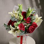Этот потрясающий букет представляет собой идеальное сочетание ярко-красных роз и элегантных белых лилий, красиво дополненное эвкалиптом для дополнительной фактуры. Композиция излучает изысканность и очарование, что делает её прекрасным выбором для романтических жестов или особых торжеств.