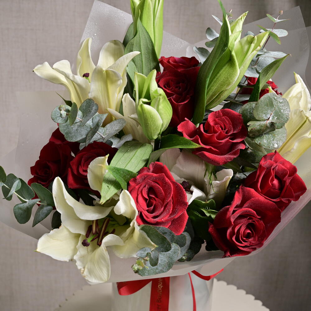 Этот потрясающий букет представляет собой идеальное сочетание ярко-красных роз и элегантных белых лилий, красиво дополненное эвкалиптом для дополнительной фактуры. Композиция излучает изысканность и очарование, что делает её прекрасным выбором для романтических жестов или особых торжеств.