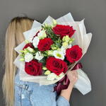 Red rose - 7 шт. Ribbon - 1 шт. Eustoma white - 4 шт. Pistachio - 3 шт. designer wrapping - 1 шт.