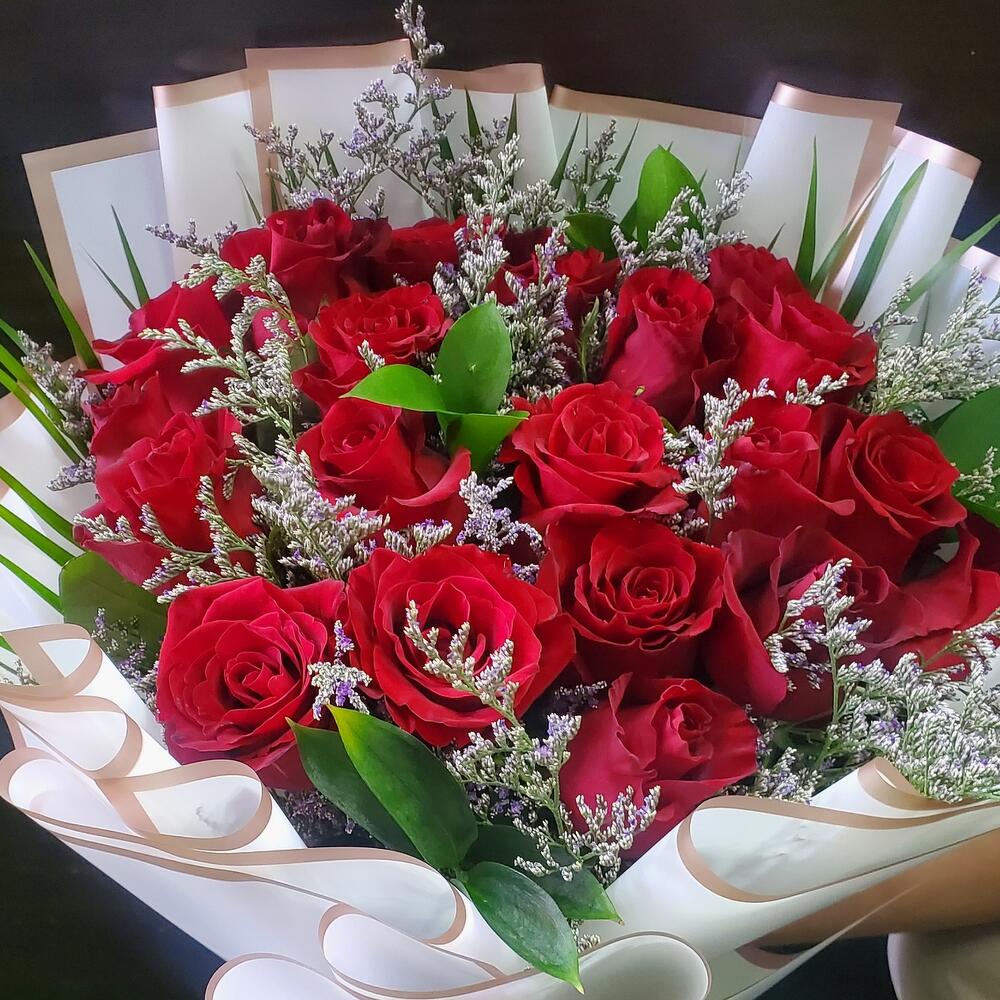 Red rose - 24 шт. Ruscus - 10 шт. Limonium - 5 шт.