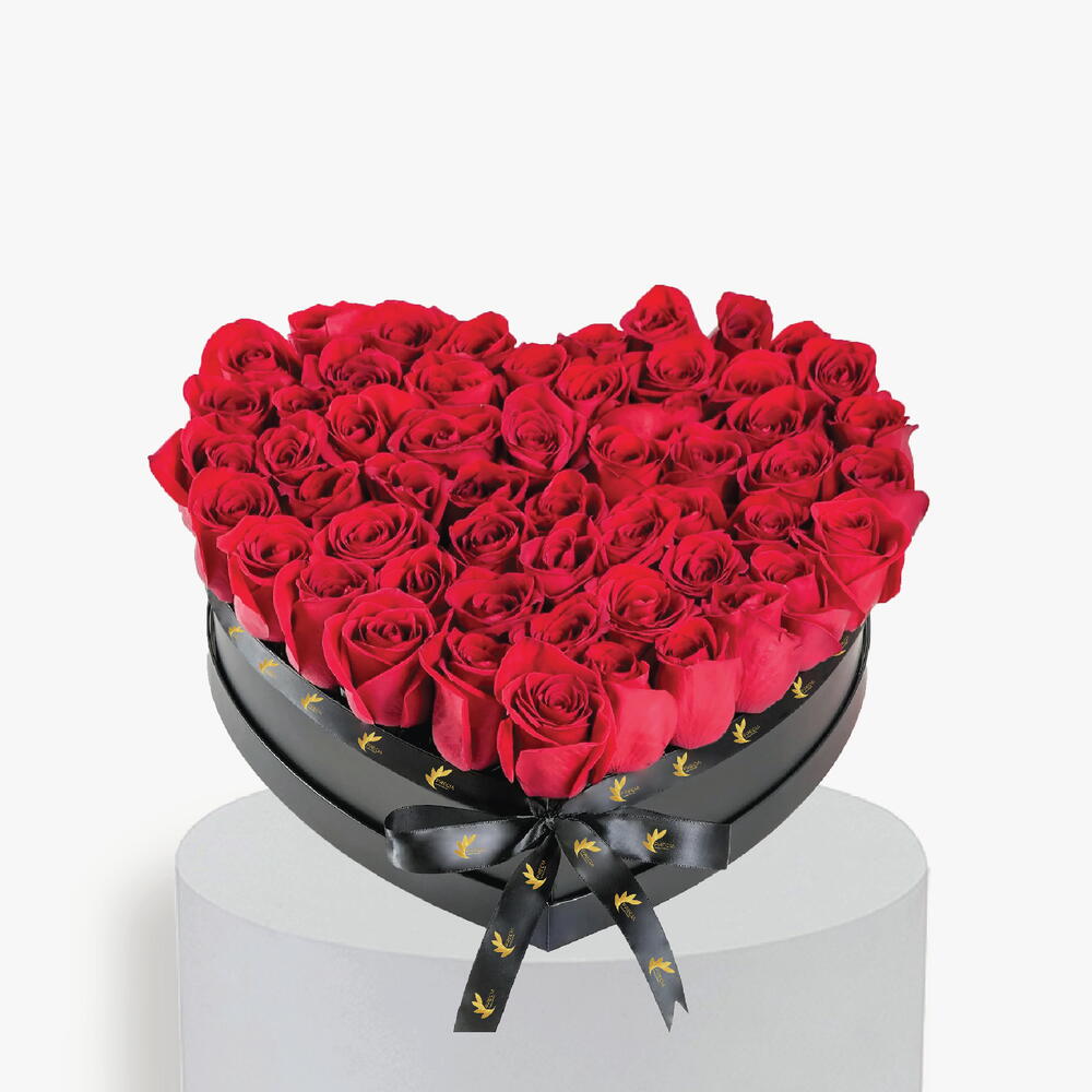 Красные розы в средней коробке в форме сердца