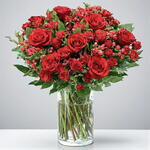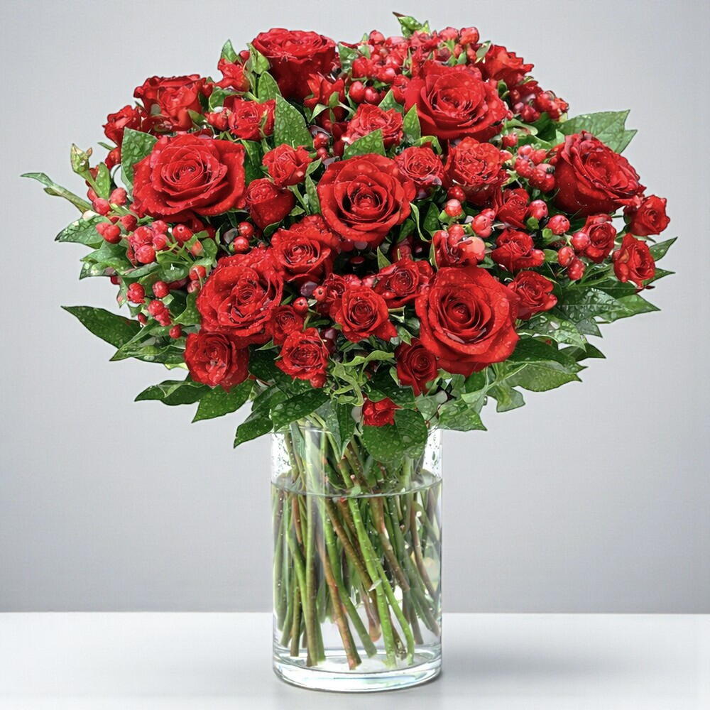 Эффектная композиция из свежих красных роз, украшенная богатыми ягодами гиперикума и пышной зеленью, красиво оформленная в прозрачной стеклянной вазе. Смелая, элегантная и вневременная, эта цветочная работа создана, чтобы выразить глубокие чувства — идеально подходит для проявления любви, годовщин, извинений или значимых торжеств. Тщательно выполненная вручную для баланса и пышности, эта композиция в вазе приносит классическую романтику и утонченную красоту в любой момент. Лучше всего подходит для: романтических подарков, годовщин, искренних сюрпризов Стиль: Классический · Элегантный · Выразительный