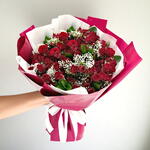 Этот очаровательный букет — сладкое выражение любви и нежности, в котором в изобилии представлены глубокие красные спрей‑розы, изящно дополненные нежной белой гипсофилой. Цветы красиво оформлены свежей зеленью и завернуты в богатую бордовую и белую бумагу, завершённую изящным бантом. Идеально для романтических случаев, дней рождения или просто чтобы порадовать кого‑то. Чтобы продлить свежесть букета, срежьте стебли под углом и поставьте их в чистую воду. Меняйте воду каждые два дня и избегайте прямого солнечного света или чрезмерного тепла, чтобы цветы оставались яркими.