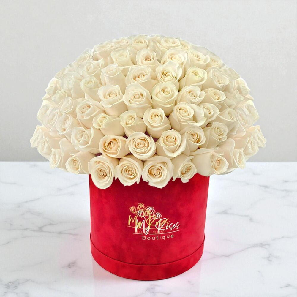 white roses - 100 шт. red velvet box - 1 шт.