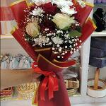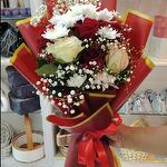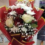 3 красные розы 2 белые кустовые розы 2 белые хризантемы (стебли) 3 белых гибсона (стебли) 3 рускуса (простые) Красная упаковка Красная лента