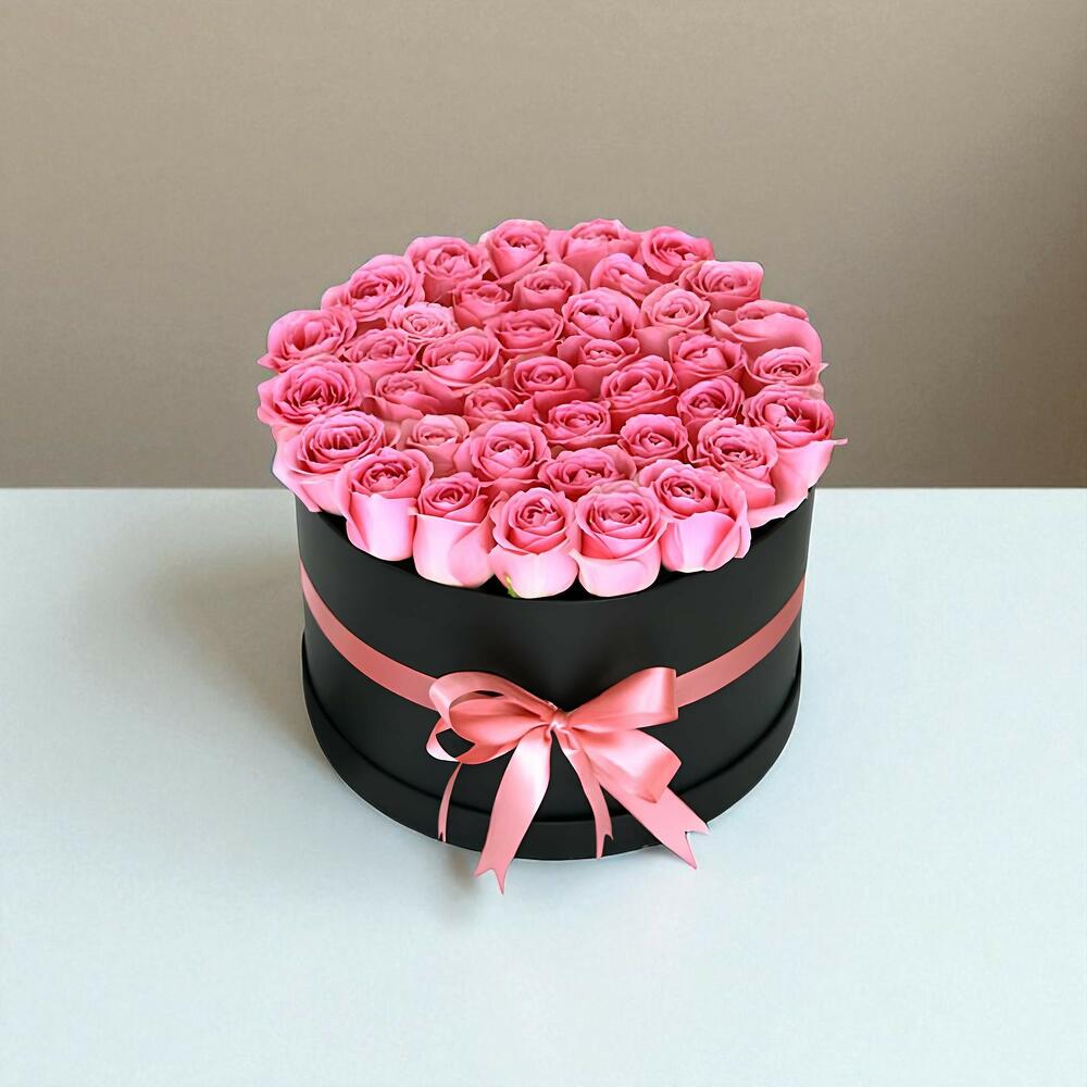 Описание - Красивое оформление из 45 роз Revival Pink в черной круглой коробке. Размер - 25*25*11