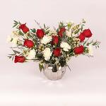 10 красных роз, 10 белых гвоздик, 2 стебля белых восковых цветов, листья и наполнители - 2 стебля синего лимониума и 1 стебель парвифолии, подготовленные в высококачественной керамической вазе из серебряного стекла - 15x12 см.