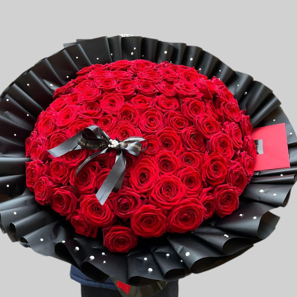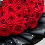 Большой роскошный букет ярко‑красных роз, элегантно оформленный в чёрную обёрточную бумагу и перевязанный чёрной лентой. Эта композиция создаёт поразительный визуальный контраст, сочетая классическую символику красных роз с современной, утончённой эстетикой. Символика и значение Красные розы: Эти цветы являются универсальным символом глубокой любви, страсти, желания и романтики. Их использовали на протяжении столетий, чтобы выражать глубокую привязанность и восхищение. Чёрная упаковка: Чёрная бумага добавляет нотку элегантности, мистики и драмы, что может возвысить традиционный романтический жест до более смелого и современного заявления. Букет из 99 роз часто символизирует вечную любовь или обещание любить кого‑то до дня смерти. Букет из 101 или более роз символизирует полную преданность и безграничную любовь. Такой грандиозный букет часто используют при значимых романтических событиях, таких как предложения руки и сердца, годовщины или День святого Валентина, чтобы сделать запоминающееся и впечатляющее признание в любви.
