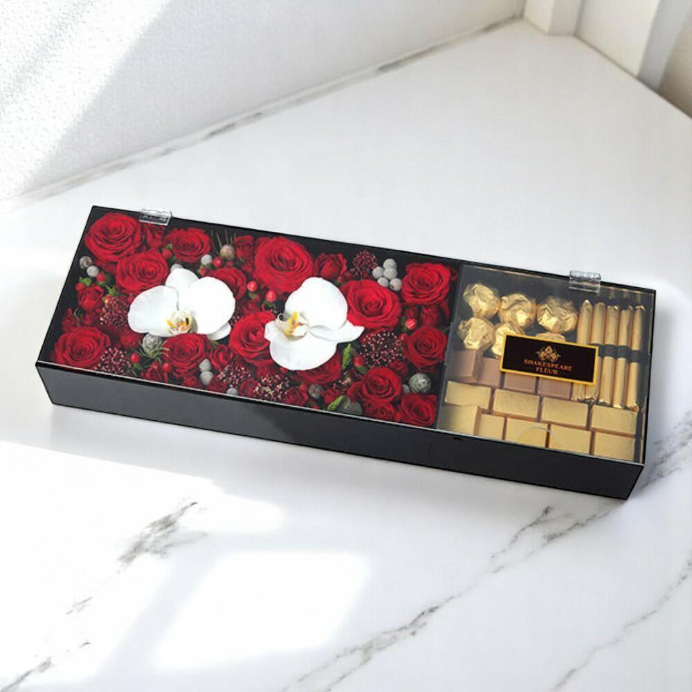 Романтическая коробка с красными розами, орхидеями и роскошными шоколадными конфетами – подарочный набор из акрила 80 см