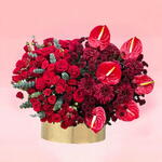 Представляем очаровательный ассортимент цветов, рисующий картину изысканного сада, изящно оформленного в круглой золотой коробке. В центре — огненная прелесть десяти красных роз и десяти кустовых роз, подчеркнутая роскошью десяти бордовых кнопочных хризантем; эта композиция символизирует вечную любовь. Она дополнительно украшена шестью яркими красными антуриумами, придающими экзотический штрих, в гармонии с пятью пышными бордовыми хризантемами. Пленительная смесь мягко покоится среди прохладных, успокаивающих тонов эвкалипта. Эта композиция «Цветы в коробке» — идеальный подарок или декоративный элемент, предлагающий великолепный вид природной красоты.